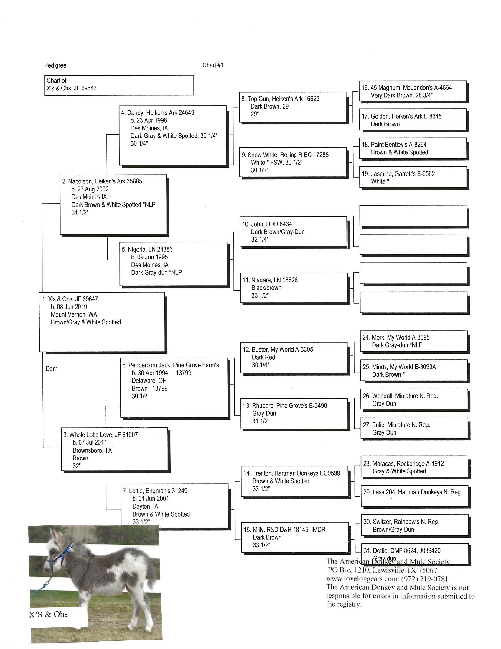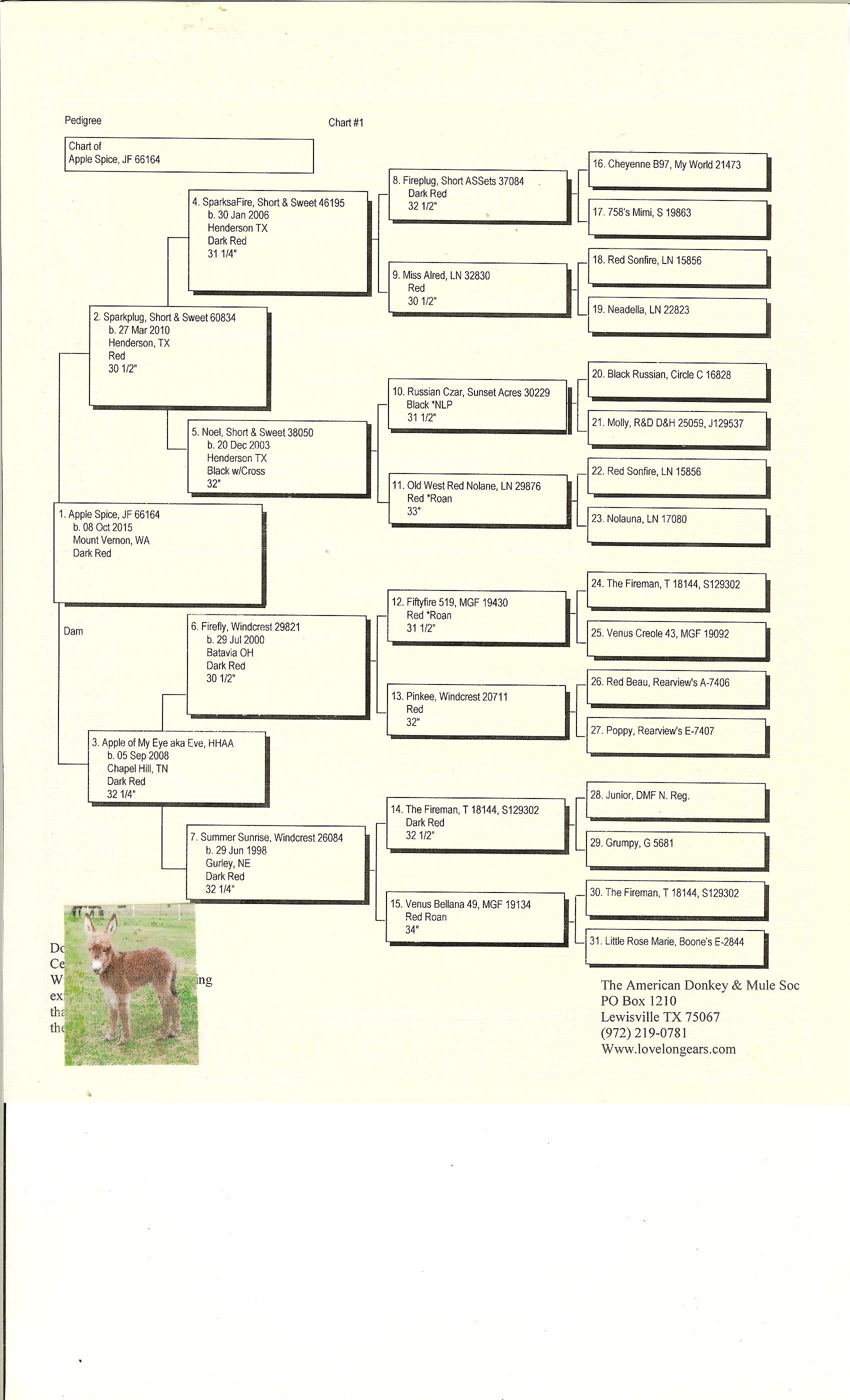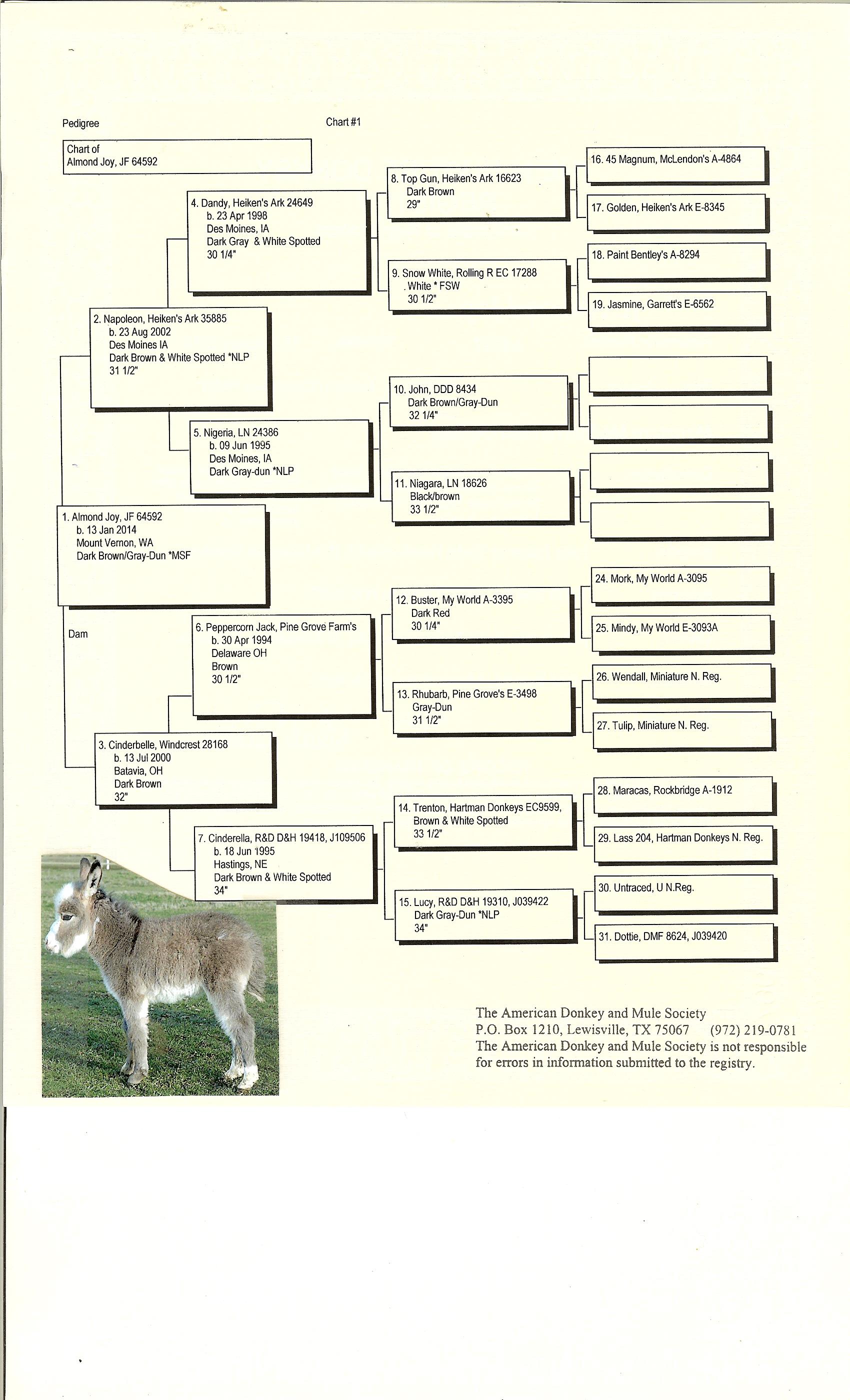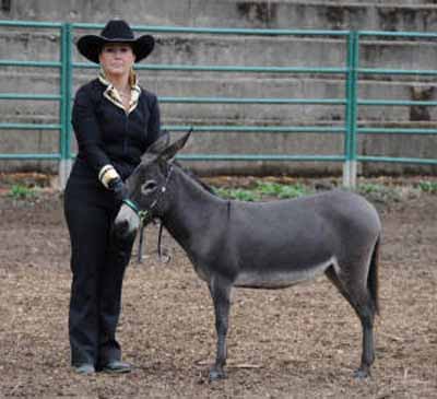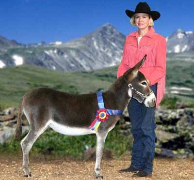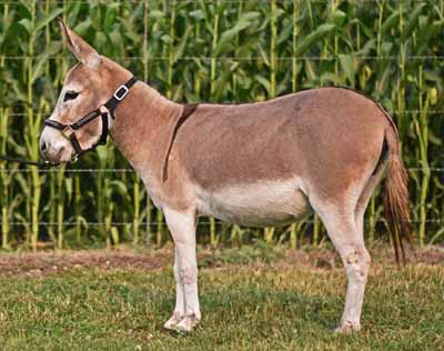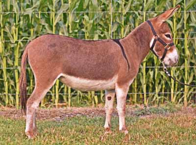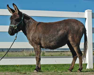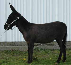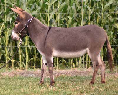 32.25" Dark gray Spotted Sire and Dams Pedigree Candy is simply stunning! She has everything you could desire in a breeding jennet. Pretty head, compact body, width of chest, great legs, and a fun loving personality. Her pedigree has a combination of both of my breeding jacks and I take great pride in knowing that I'm making a positve impact on the breed. I successfully showed her mother, JF Almond Joy and her Candy's grand dam has produced champions in the U.S., Canada, and Europe. $3,200.00 Sold to Breeding farm in Washington