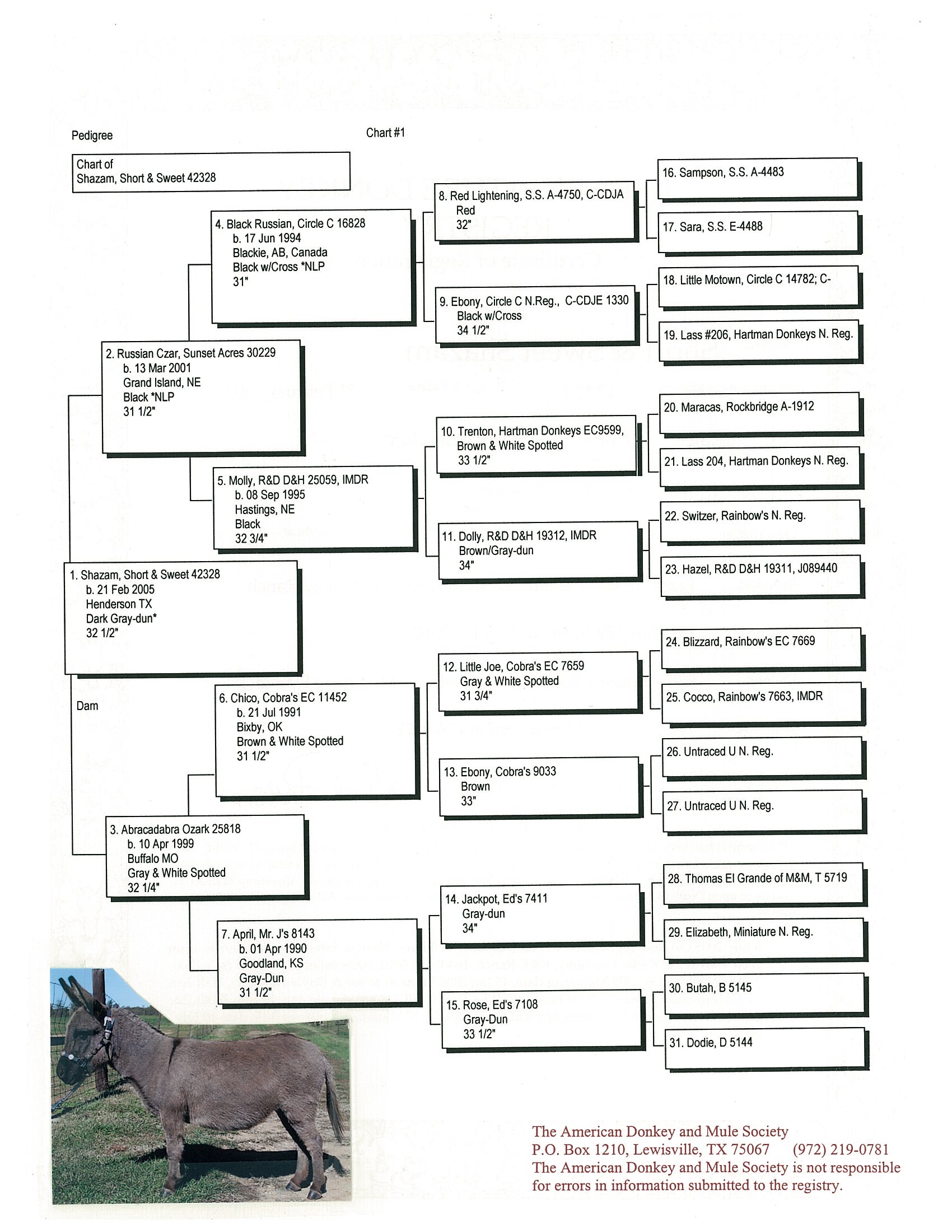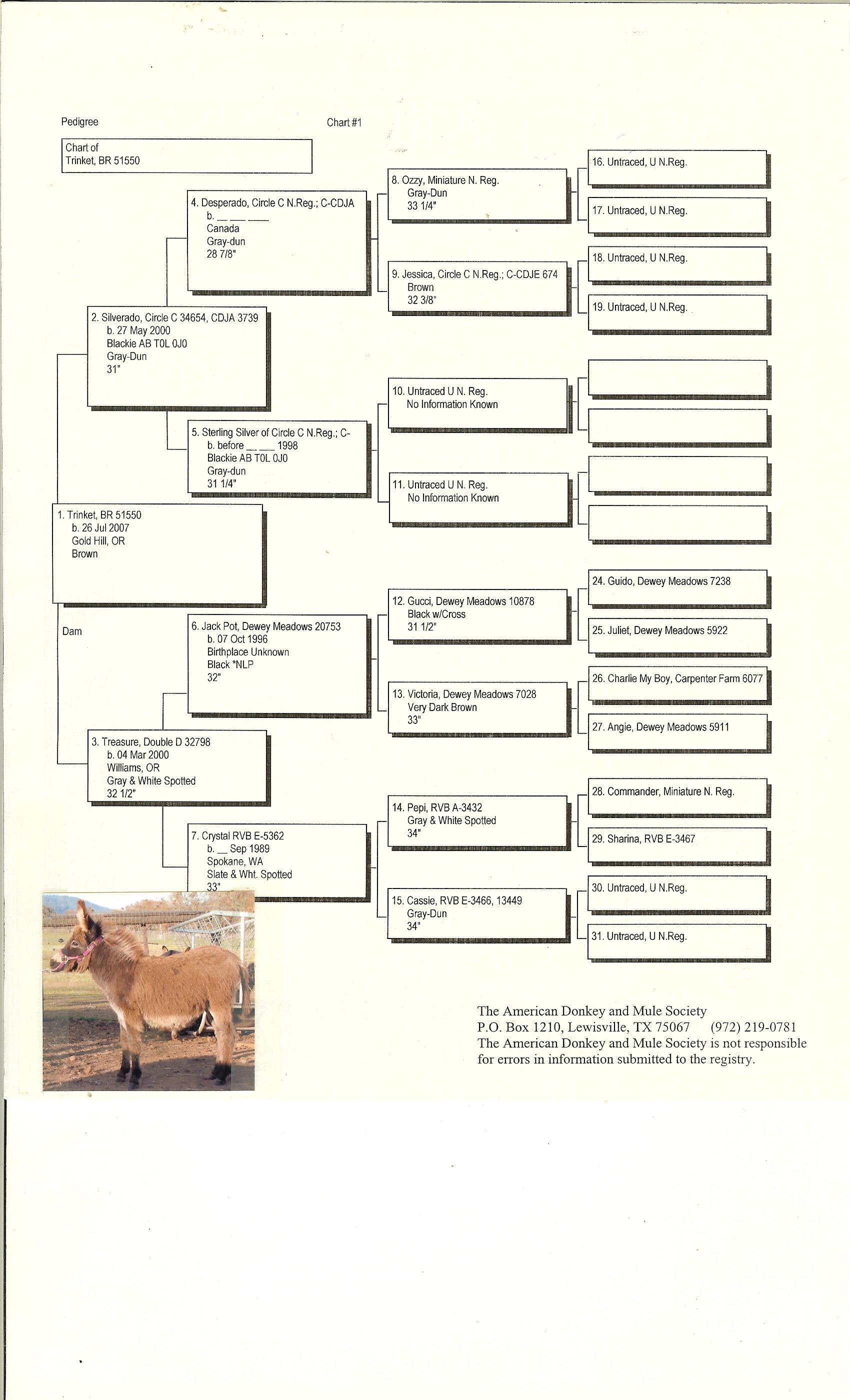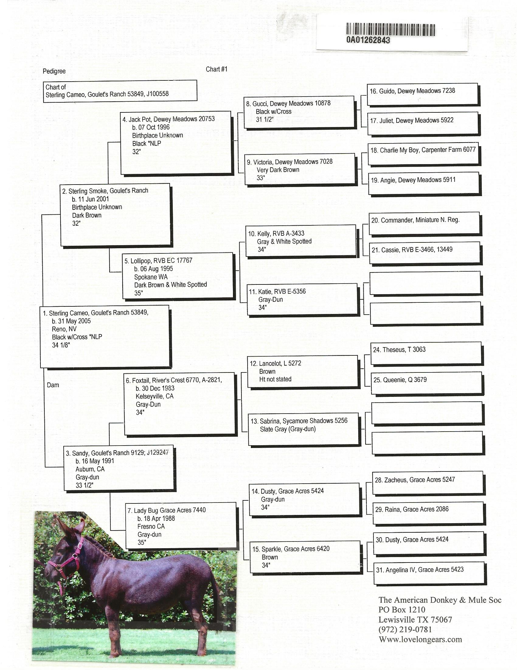 32.25" Dark gray Spotted Sire and Dams Pedigree Candy is simply stunning! She has everything you could desire in a breeding jennet. Pretty head, compact body, width of chest, great legs, and a fun loving personality. Her pedigree has a combination of both of my breeding jacks and I take great pride in knowing that I'm making a positve impact on the breed. I successfully showed her mother, JF Almond Joy and her Candy's grand dam has produced champions in the U.S., Canada, and Europe. $3,200.00 Sold to Breeding farm in Washington