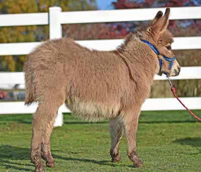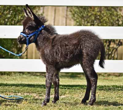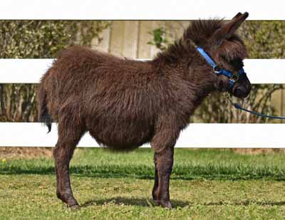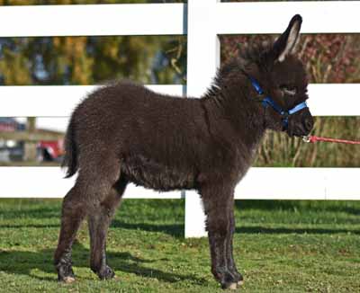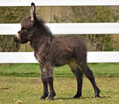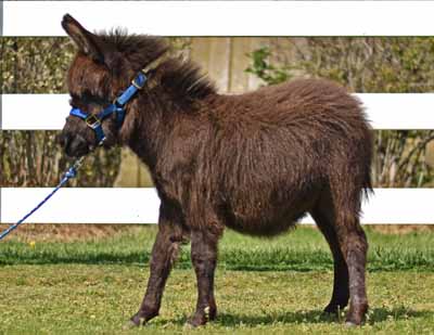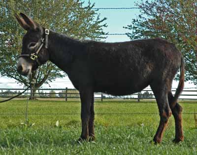 34" Blk/Brn Rambo is a striking dark jack that will probably mature in the 33" to 34" range. He has a great legs, is very drafty and will be big enough to be a fun cart donkey at maturity.