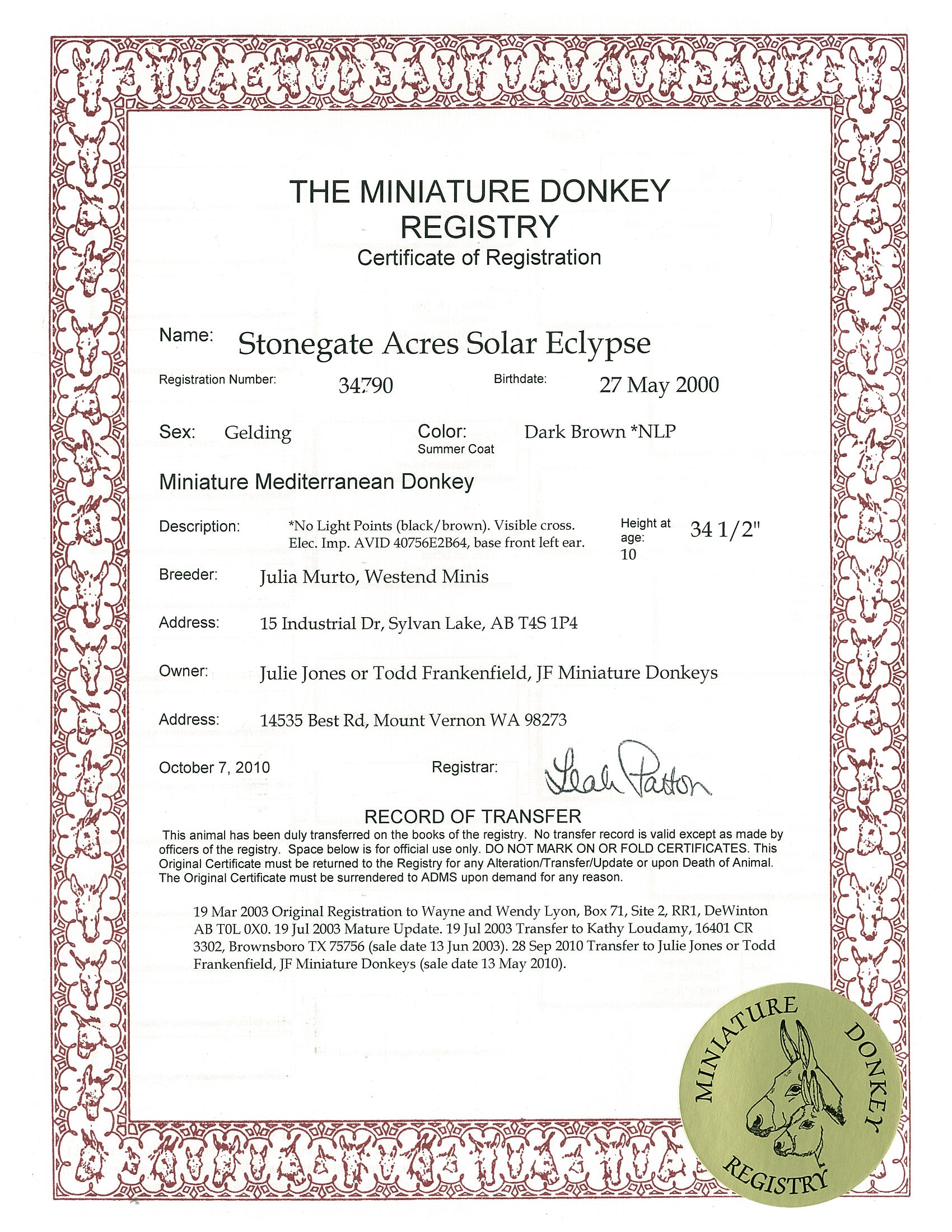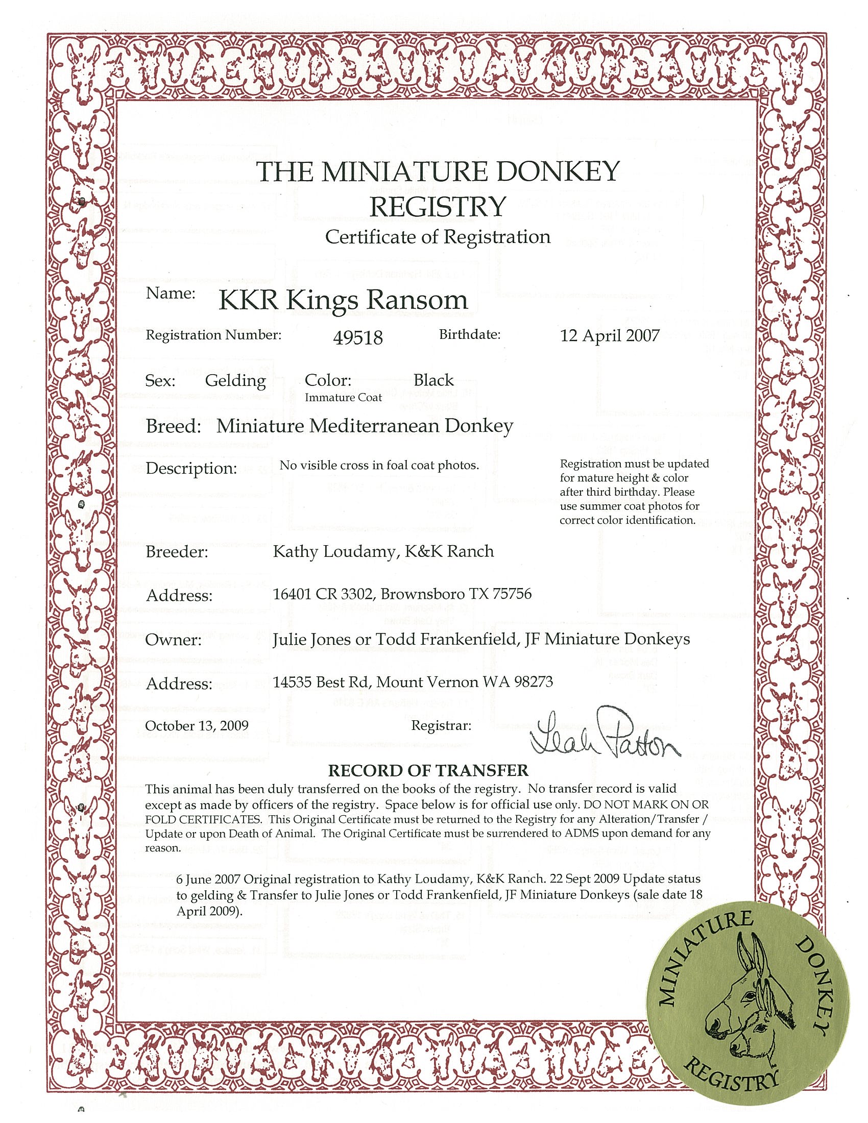 2011 Wine Country Miniature Donkey Classic Reserve Champion High Point Pre-Green (10 1/2 months old - First show) 2012 NMDA National show-1st Place Yearling Geldings and Reserve High Point Pre Green. 2012 Pacific Northwest Miniature Donkey Classic - Reserve Champion High Point Pre-Green Sold