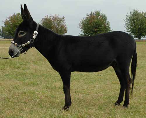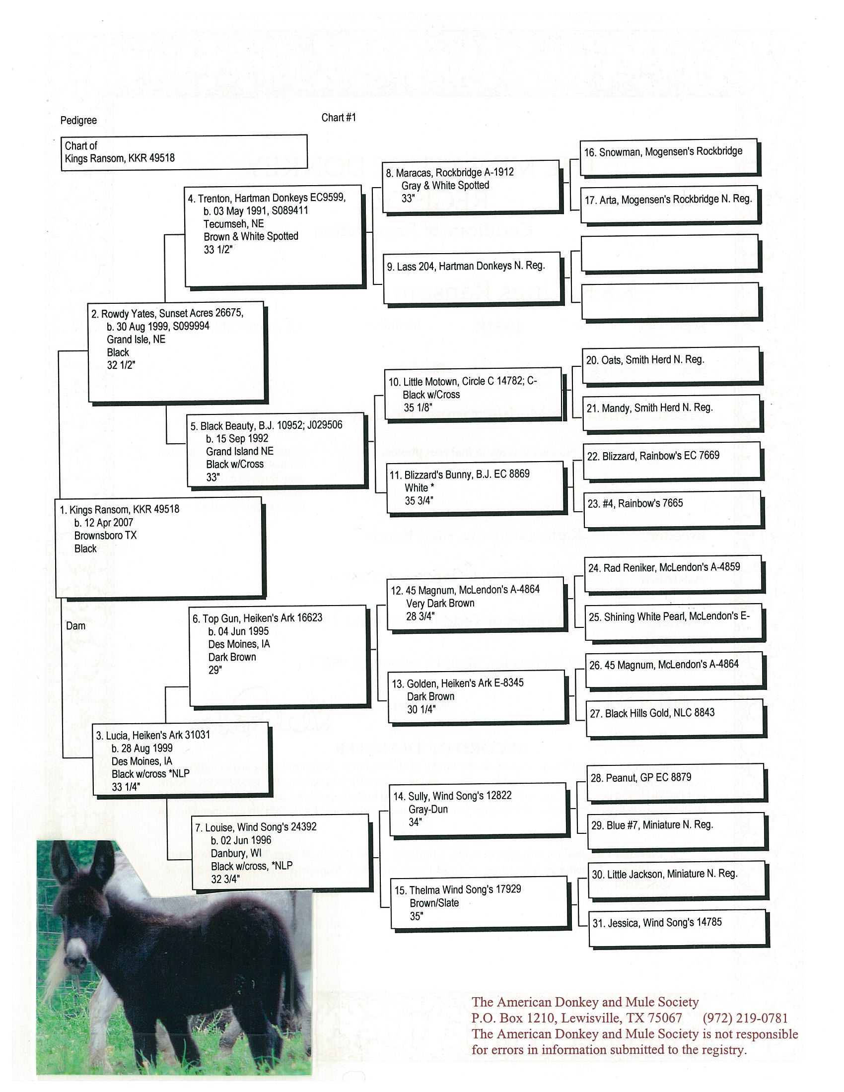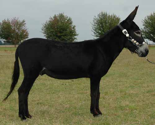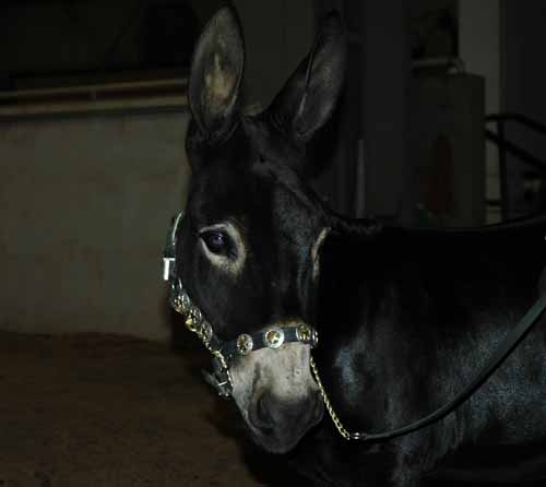 Heinken's Ark Lucia, 33.5" Black w/NLP Click to enlarge AMDS complete Pedigree Ransom is so much fun. He's always thinking and wants to be busy all of the time. His expert training up through his yearling year makes him a joy to show. He's already a multiple NMDA class winner and won his pre-green trail class at the 2009 Oregon Mule and Donkey Show. This guy is built to be the ultimate performance donkey. Big bones, powerful rear end, and wide chest help to insure his athletic ability. And to top it off his black coat with white points make him look very distinguished. Ransom is a full brother to NMDA and ADMS National Junior Champion, KKR IsaBell. 2015 NMDA National Show Reserve Highpoint - Non Driving