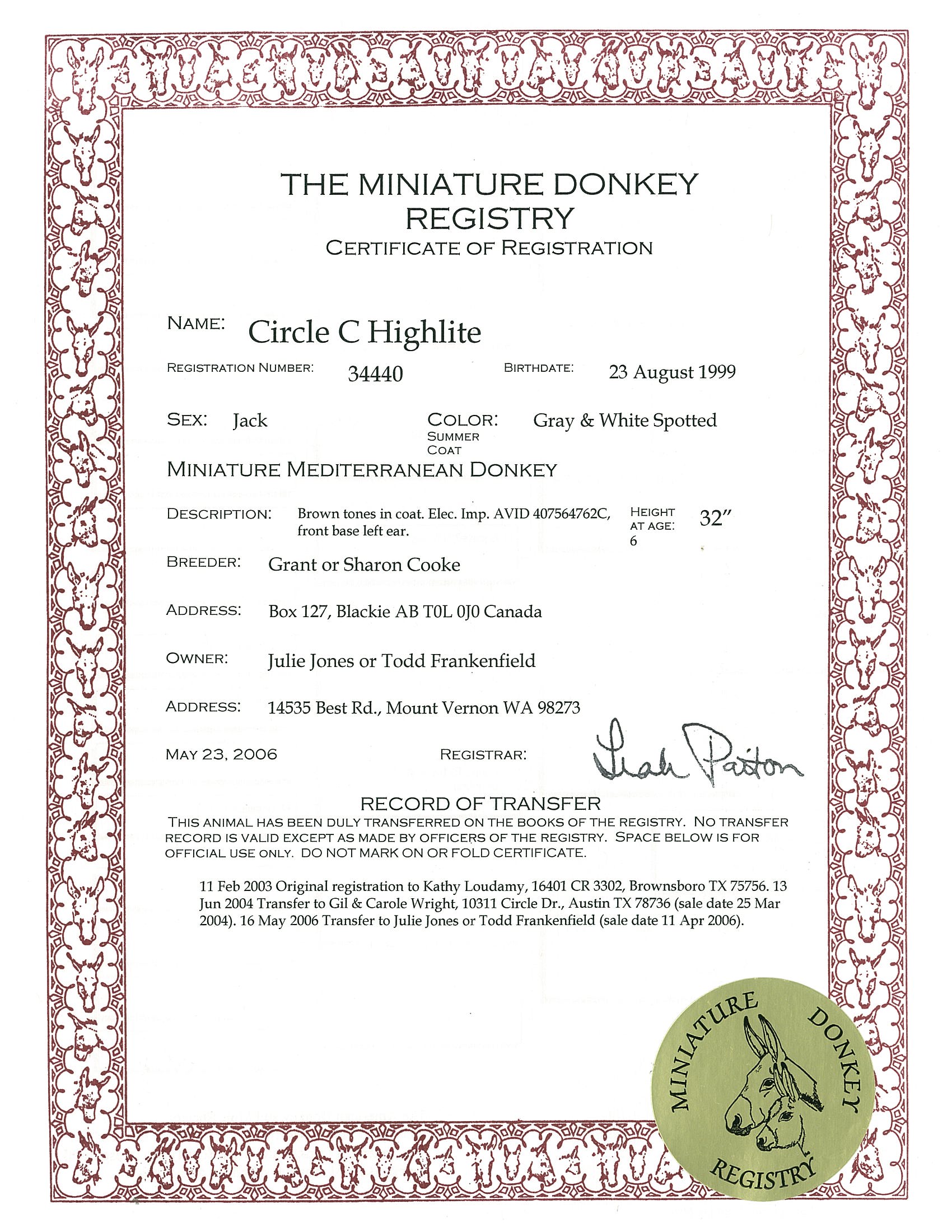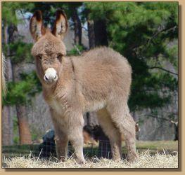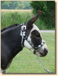When I purchased Circle C Highlite I knew I was on the right track to producing quality foals. Kathy is a leading breeder and exhibitor of miniature donkeys. Circle C Highlite is kind and gentle, and has very drafty and correct conformation. He is a well balanced, heavy boned jack. His easy going temperament make him an asset to my breeding program. He is a short bodied, wide jack, with a nice round rear end, gorgeous legs, a wide chest and beautiful eye, and a well defined jaw line. The Cooke's,