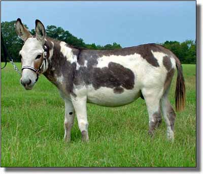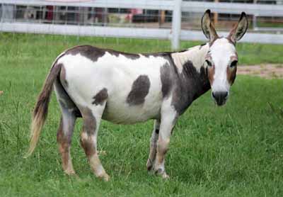 Heiken's Ark Napoleon is my dark spotted herd sire. He's a heavy-boned, compact jack with a tiny, short head, heavy jaw and correct legs. He has deep halos around every single one of his spots. Napoleon has a lot of interesting colors and donkeys in his background including McLendon's 45 Magnum, a 28 ¾" dark brown jack. He previously stood at Half Ass Acres in Tennessee and is known for producing correct foals. His son, HHAA Sweet Spotz was first in the spotted class at the 2011 NMDA National Show in Waco, Texas and sold to the Netherlands for $15,000. Our JF Black Pearl was second in a large yearling jennet class at the 2010 NMDA National Show in Red Bluff, California and second in the two year old jennets at the 2012 NMDA National Show. I have bred him to several black jennets and many jennets that have spots in their pedigree. His foals are stocky, straight, have beautiful heads, and great legs.