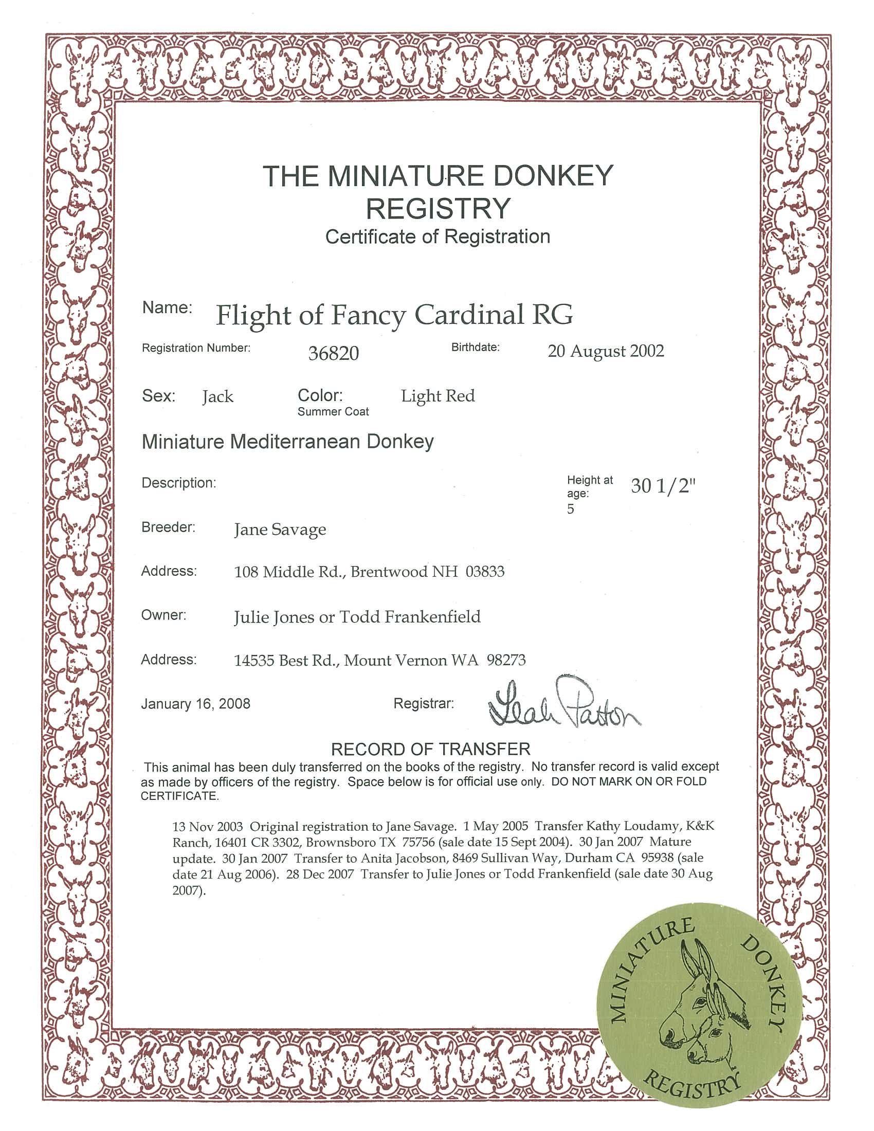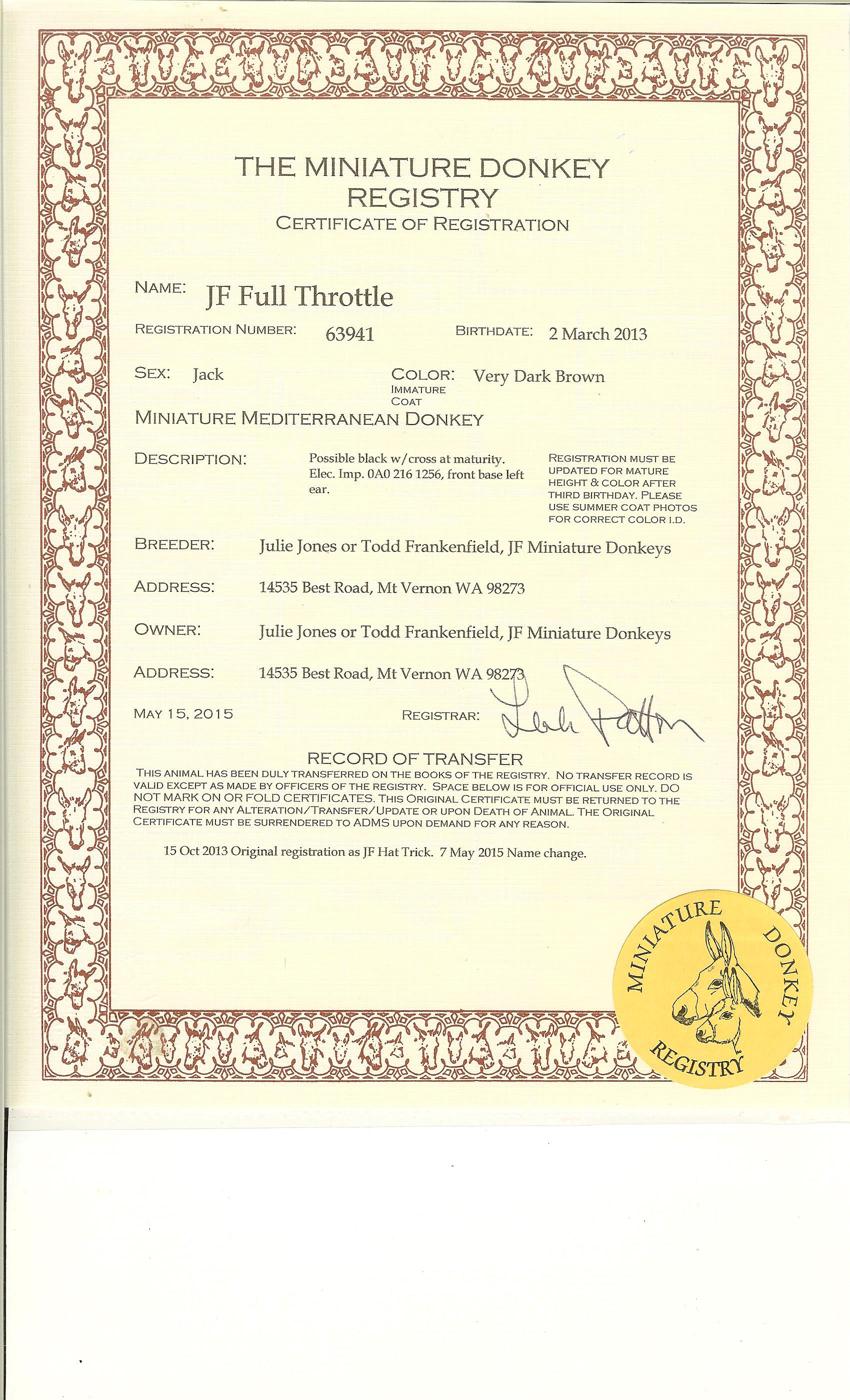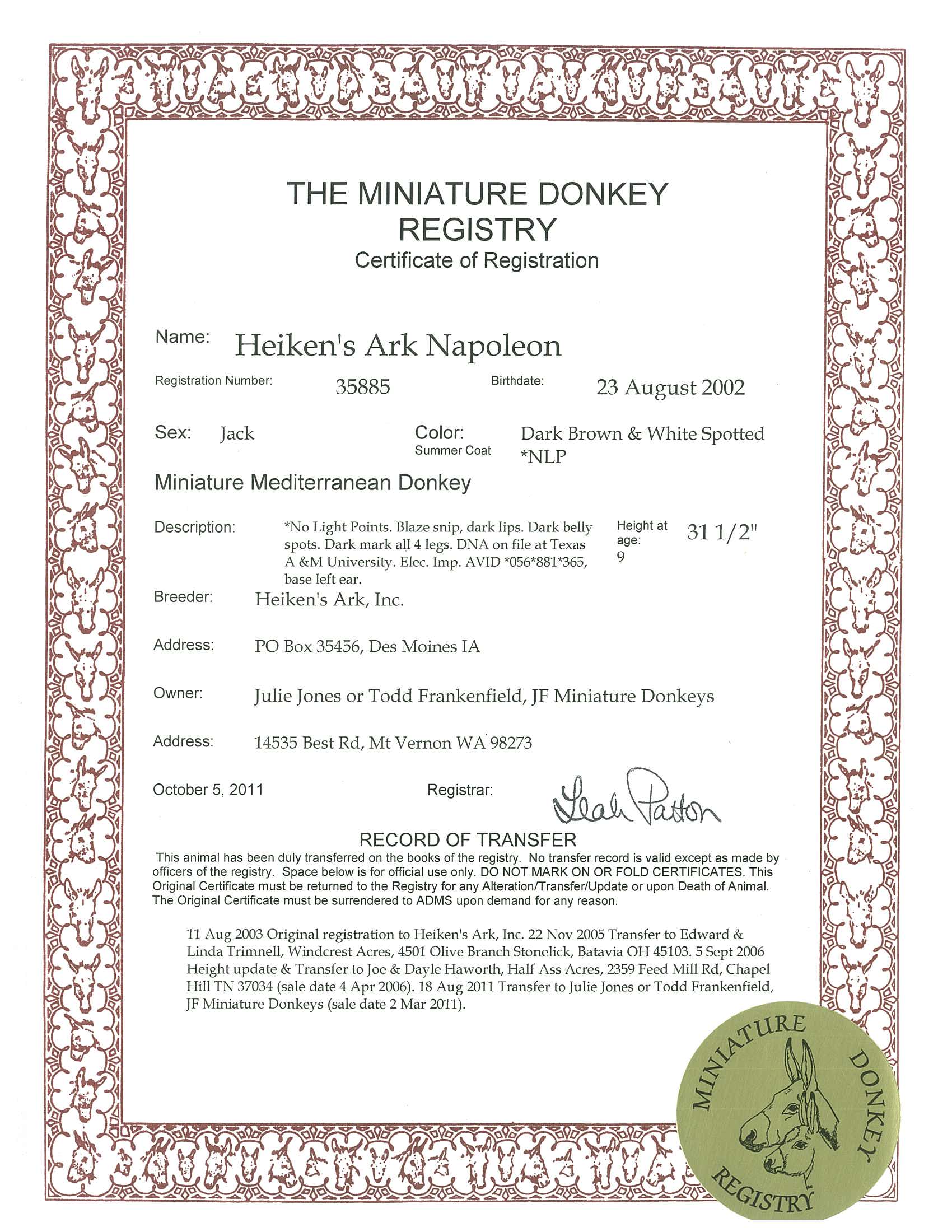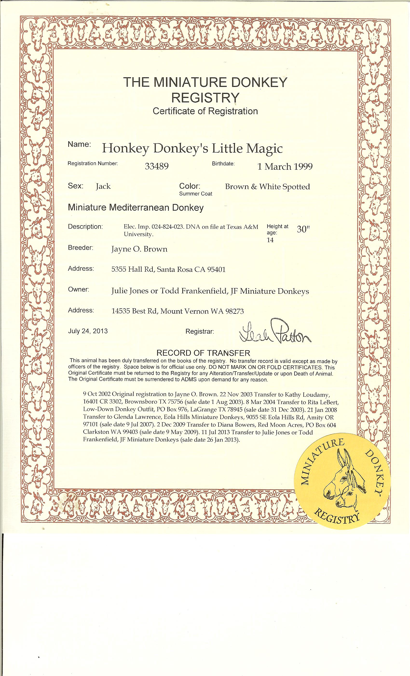 Donkey's Spice, 32" Dark Brown Click to enlarge AMDS complete Pedigree