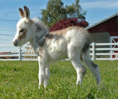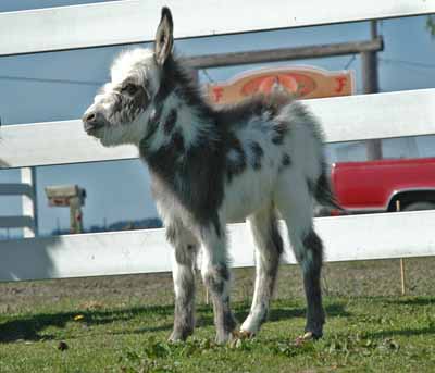 "Party Girl" is no doubt my idea of an ideal miniature donkey! Sure her color is fabulous, but her conformation is too. She has her father's beautiful head, width in the chest and rear. and great legs. And to top it off she's a doll. I feel strongly that this little girl will be winning her share of halter and performance classes in the future. SOLD Pedigree coming soon