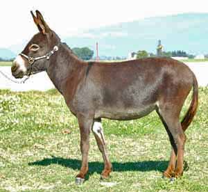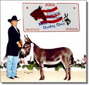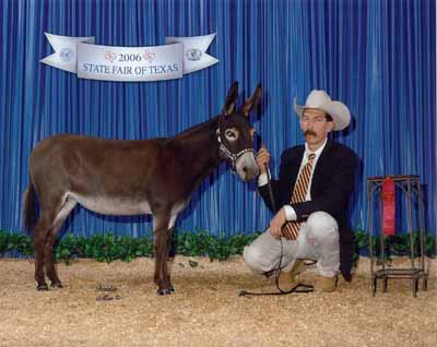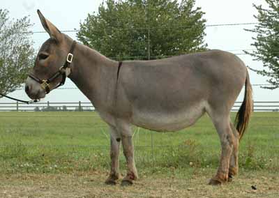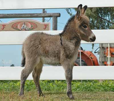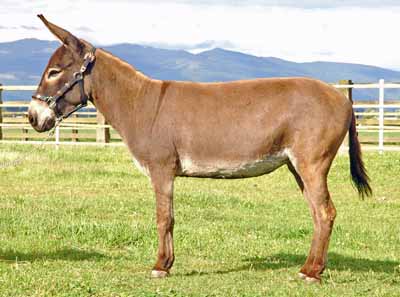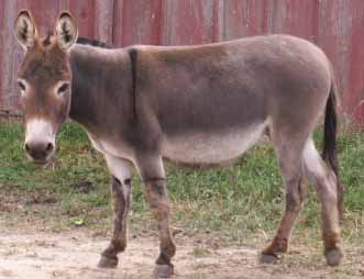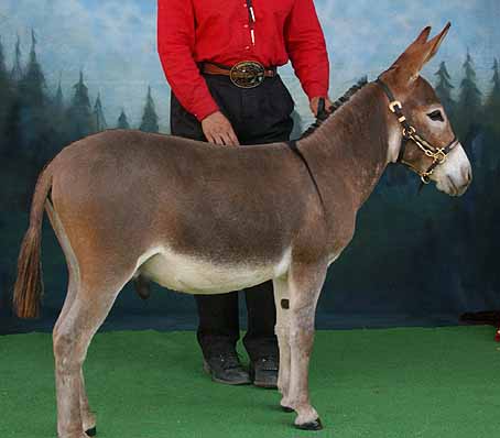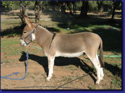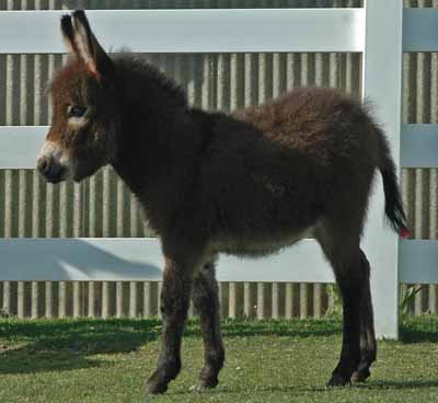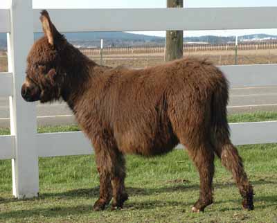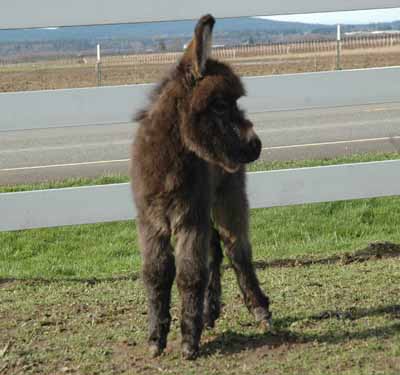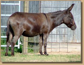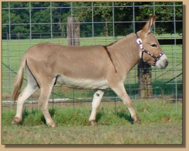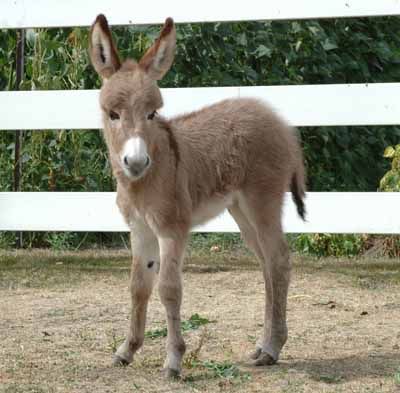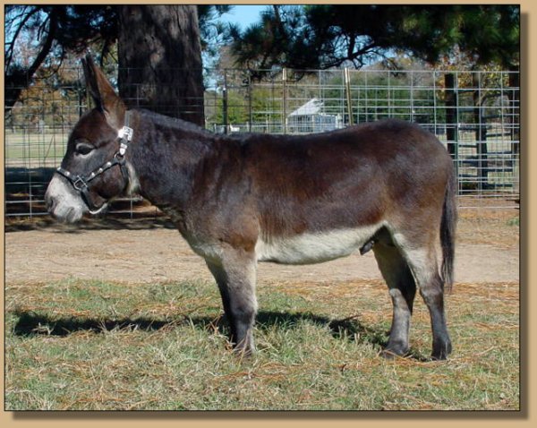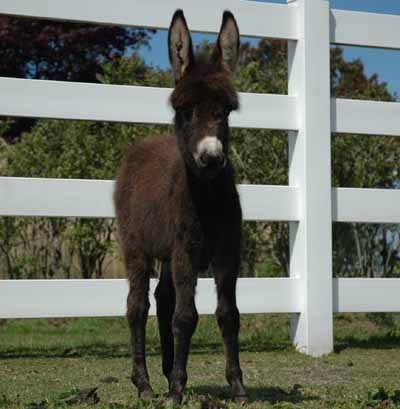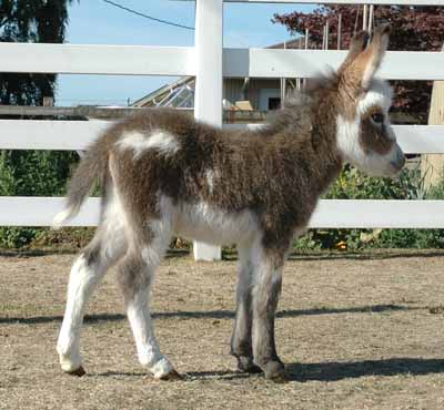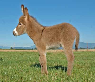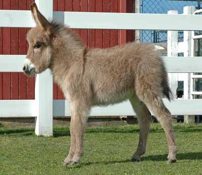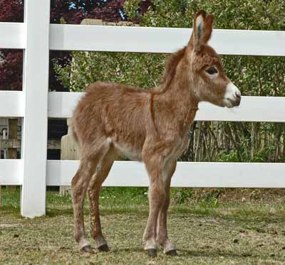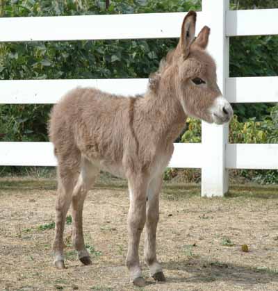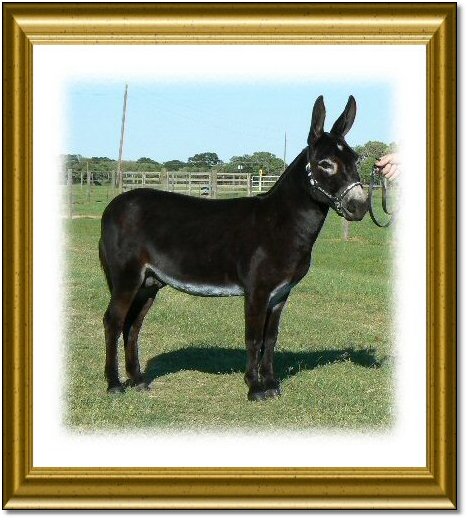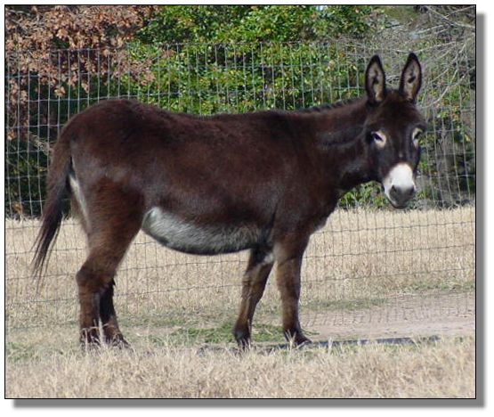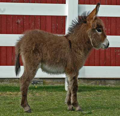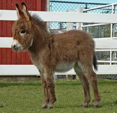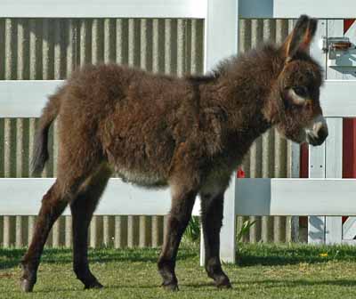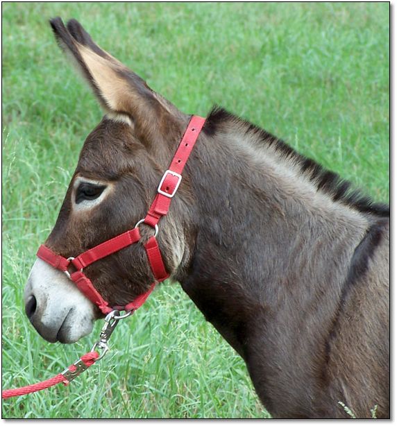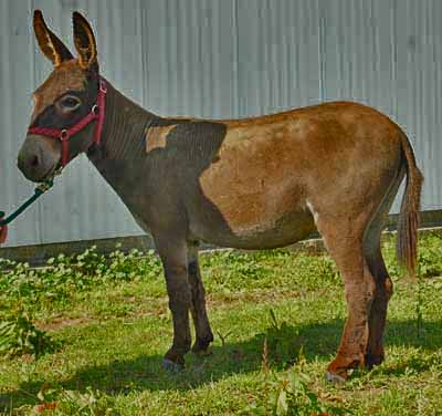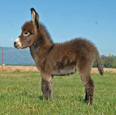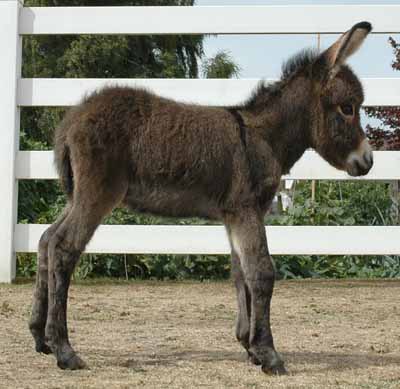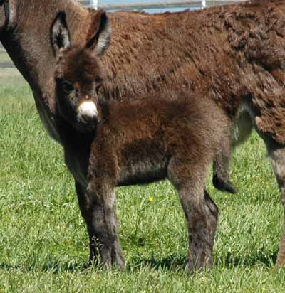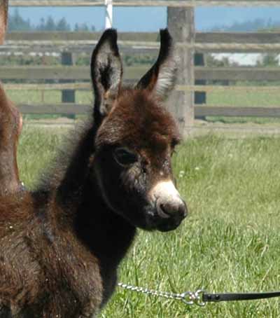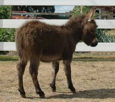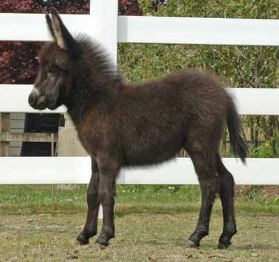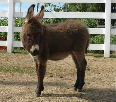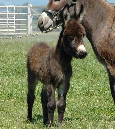 " Brown I don't say that a donkey is stunning very often, but this little girl truly earns the title. It's not a surprise since her dam is a best of breed winner and her grandfather is a national champion and best of breed. She knows she is beautiful and demands to be noticed at all times. Visitors are surprised to find her following them everywhere. DeDe already trots beside me and she should be very easy to train for halter. SOLD Pedigree coming soon