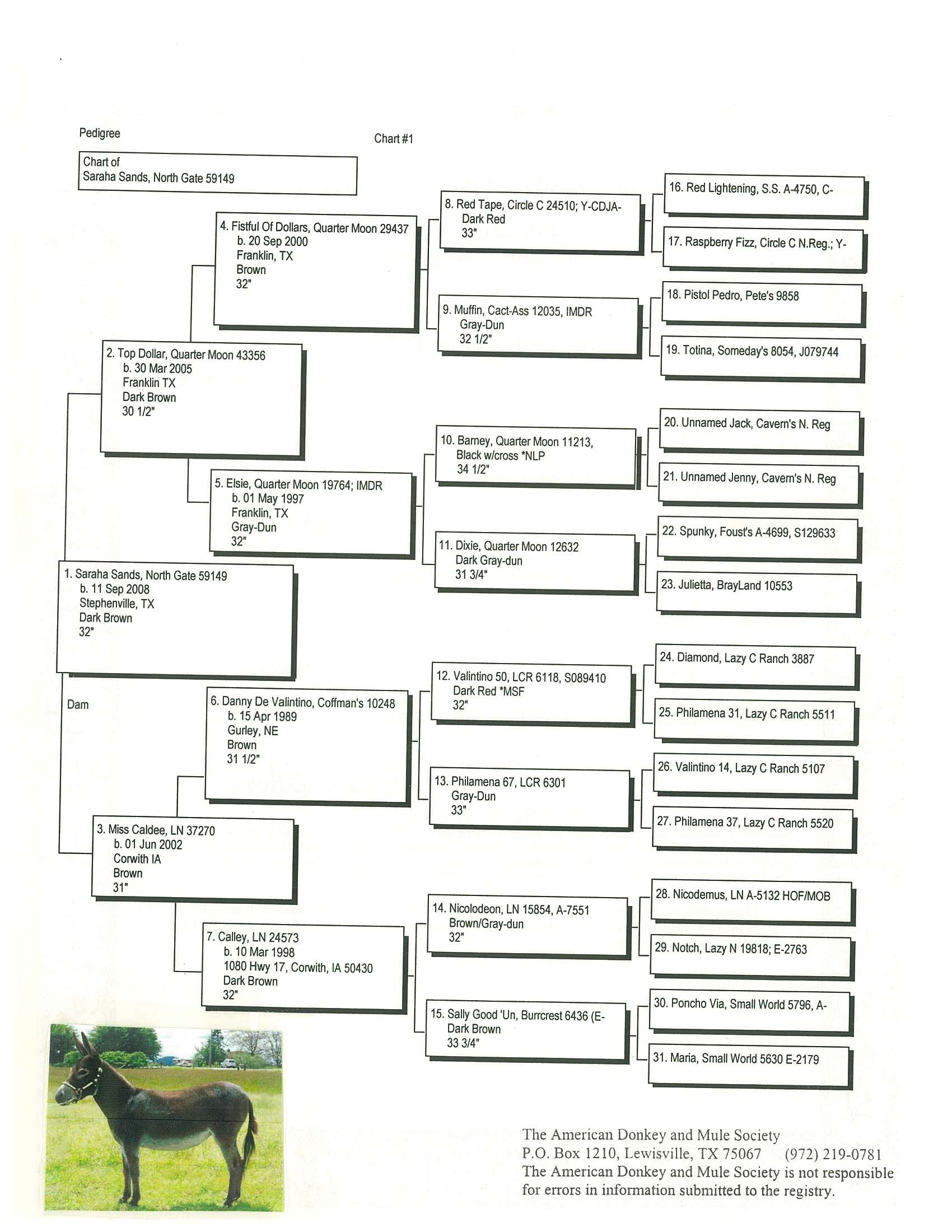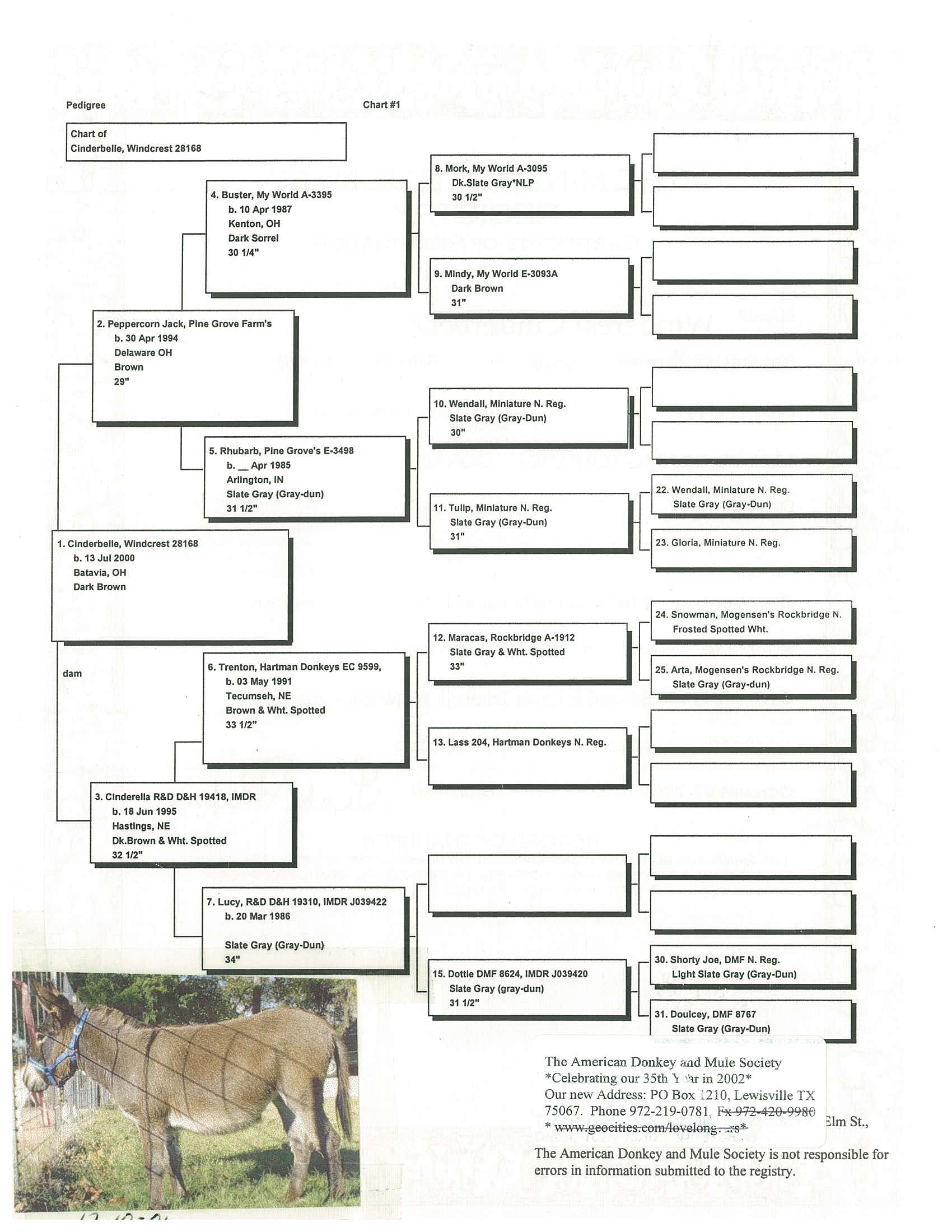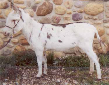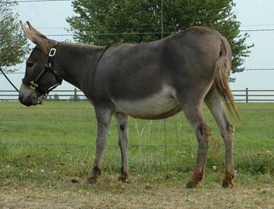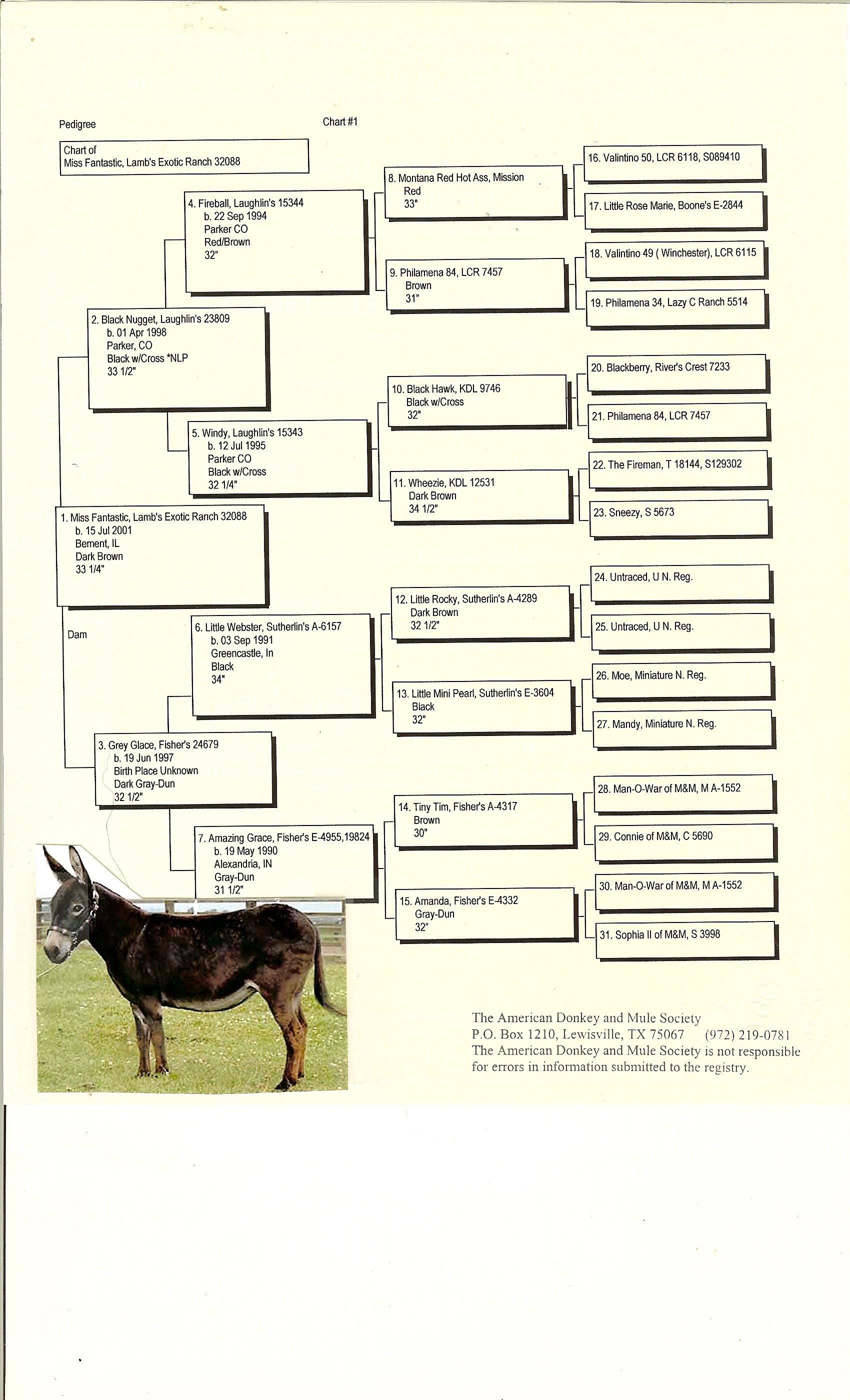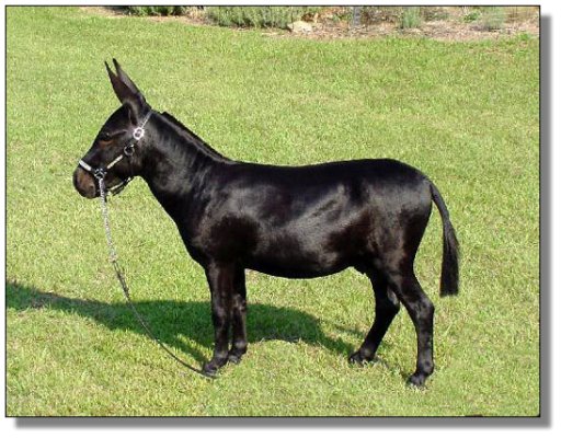 Dark Gray Jennet w/NLP This little girl rates a ten on the cuteness scale! Plus she has super conformation and a fun confident personality. Her dam Shazam is one of my best producing jennets. Shazam is the dam of JF Black Pearl (by Napoleon) who has placed second in her halter class at the NMDA National Show twice. Trixie has an interesting black spot on the outside of her left hock. Click to enlarge AMDS complete Pedigree