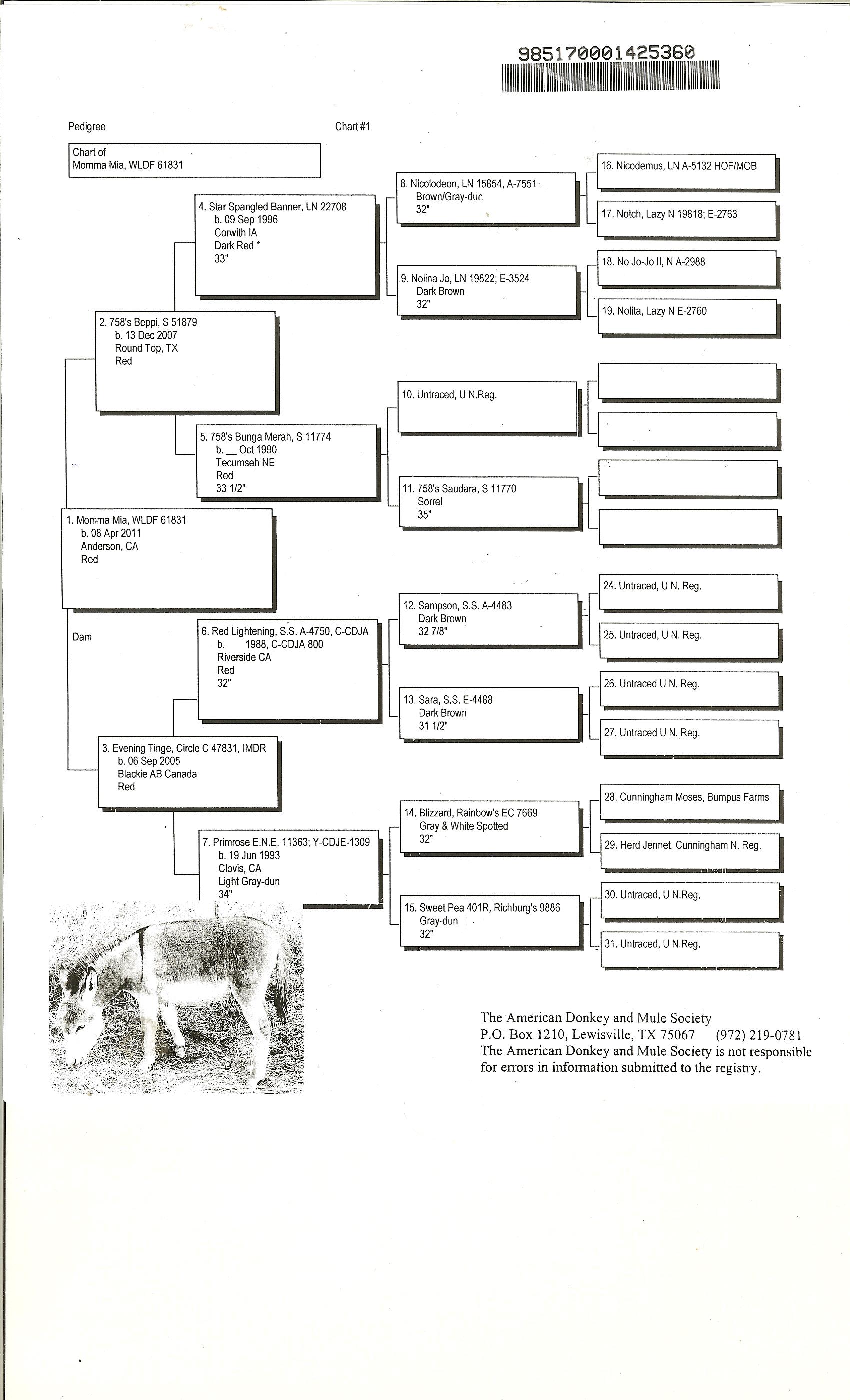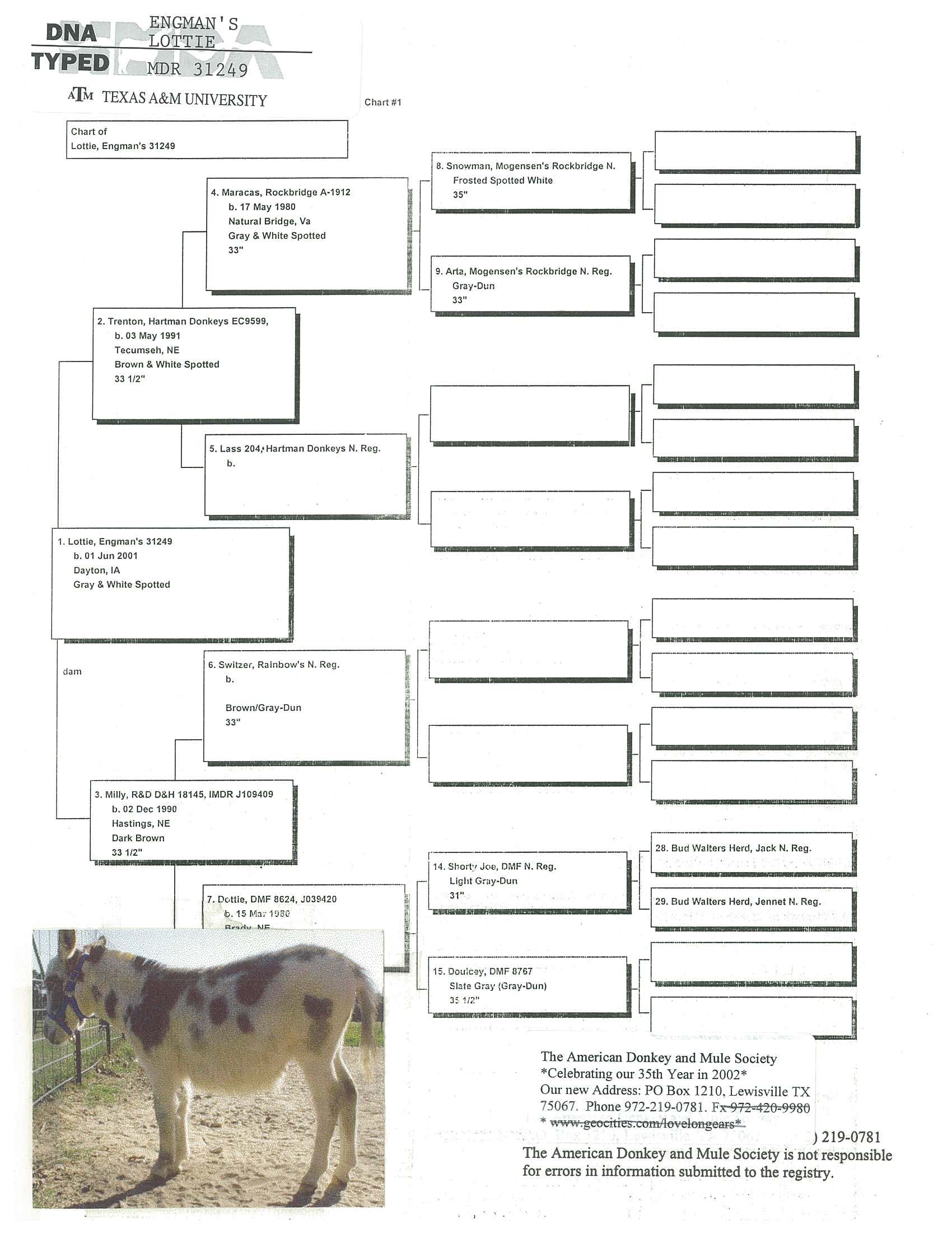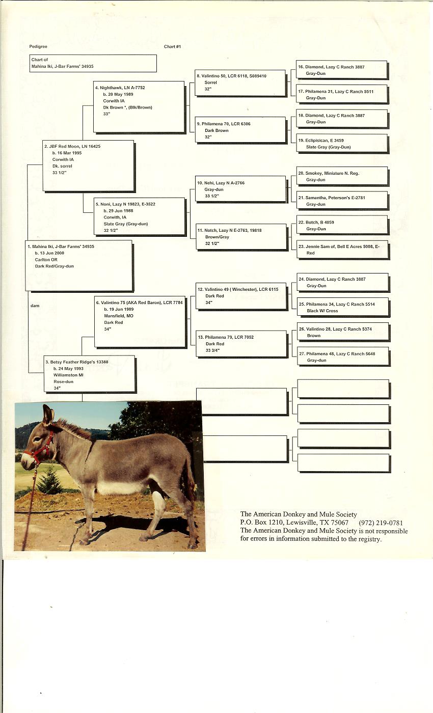 Dark Gray Jennet w/NLP This little girl rates a ten on the cuteness scale! Plus she has super conformation and a fun confident personality. Her dam Shazam is one of my best producing jennets. Shazam is the dam of JF Black Pearl (by Napoleon) who has placed second in her halter class at the NMDA National Show twice. Trixie has an interesting black spot on the outside of her left hock. Click to enlarge AMDS complete Pedigree
