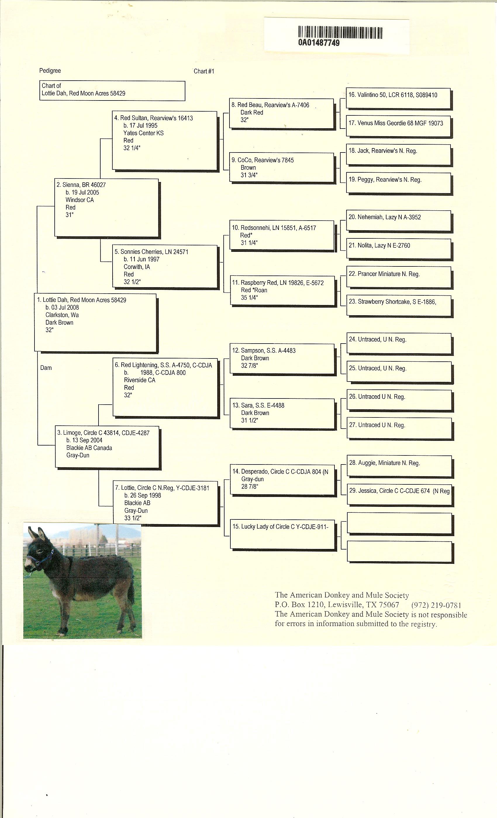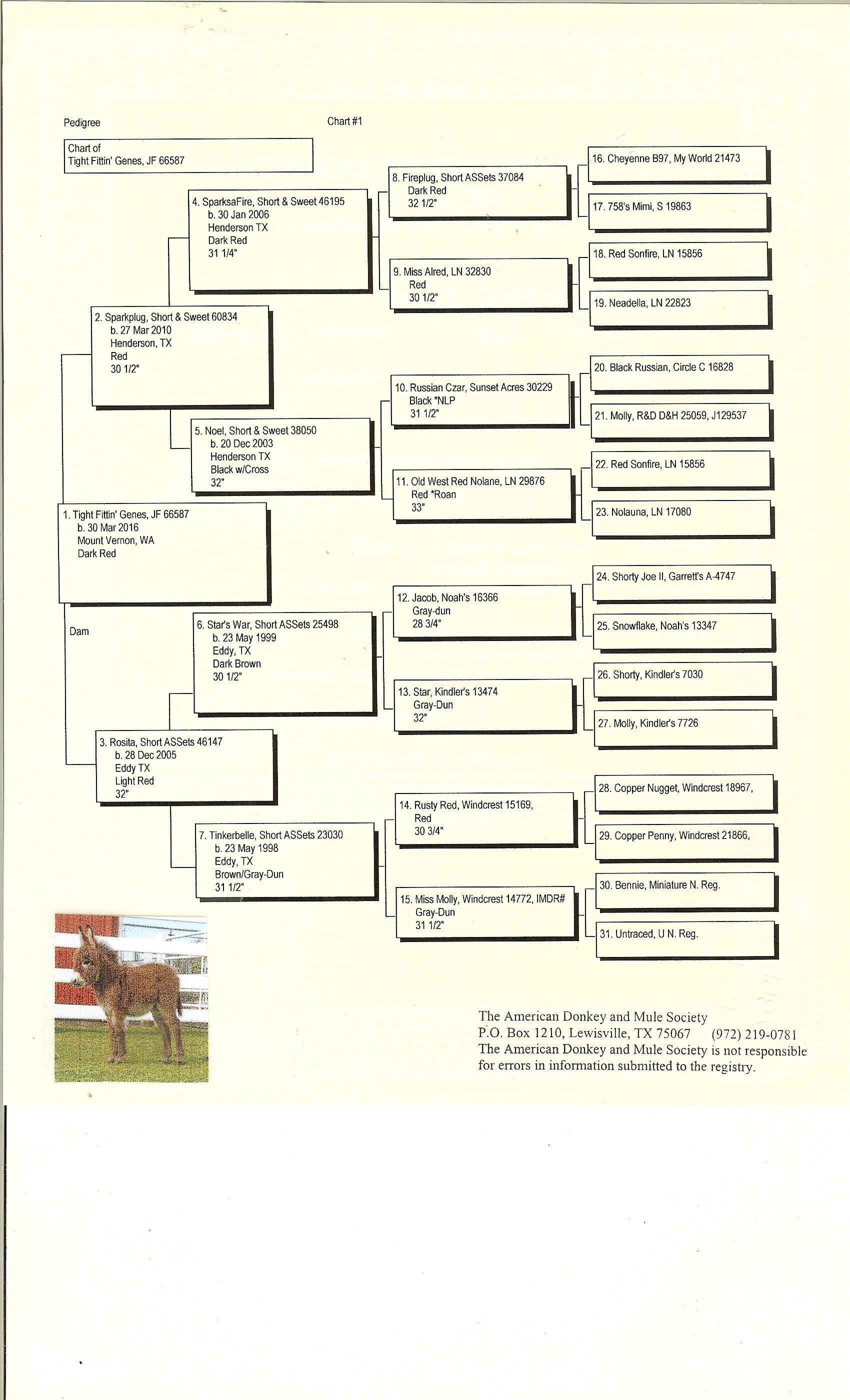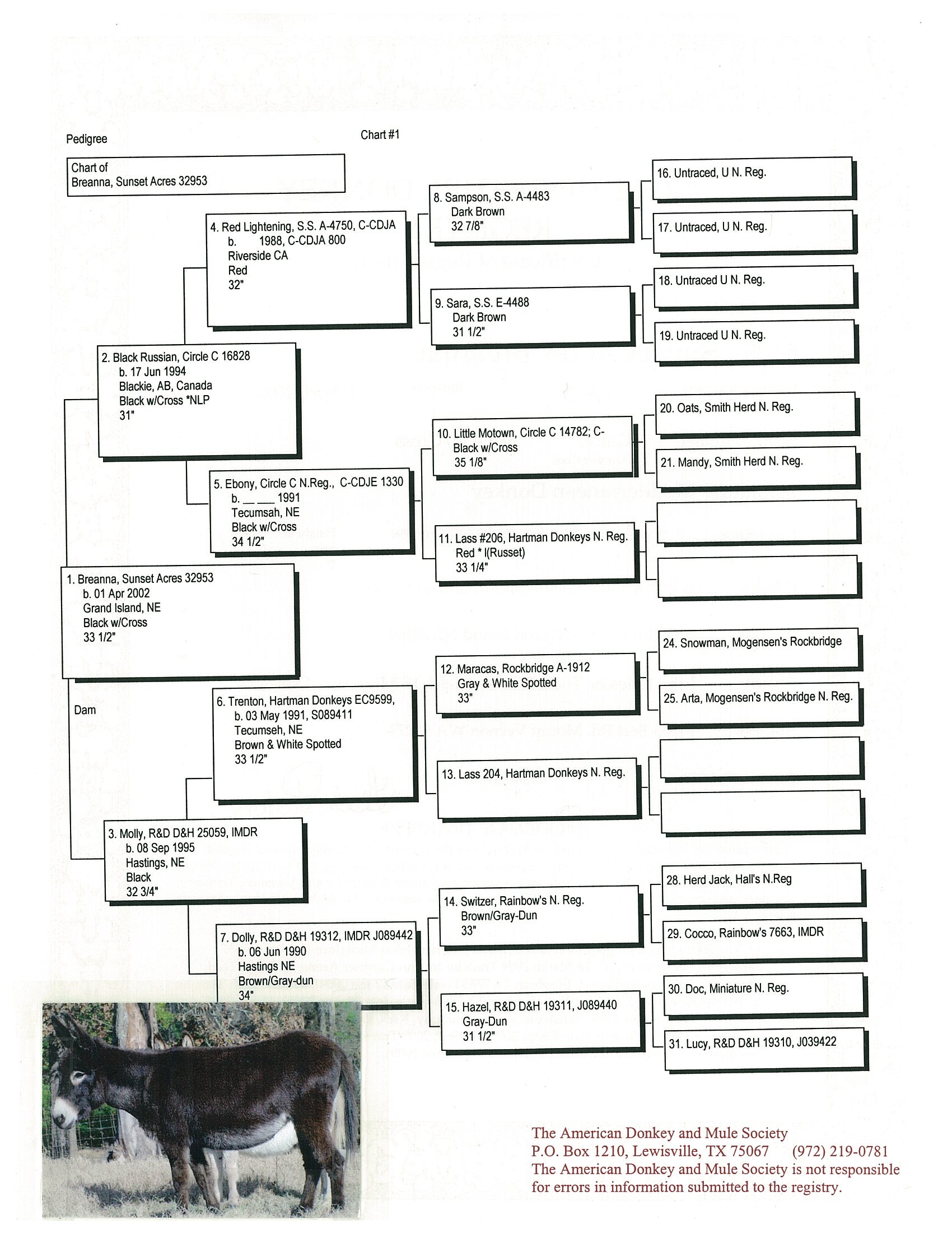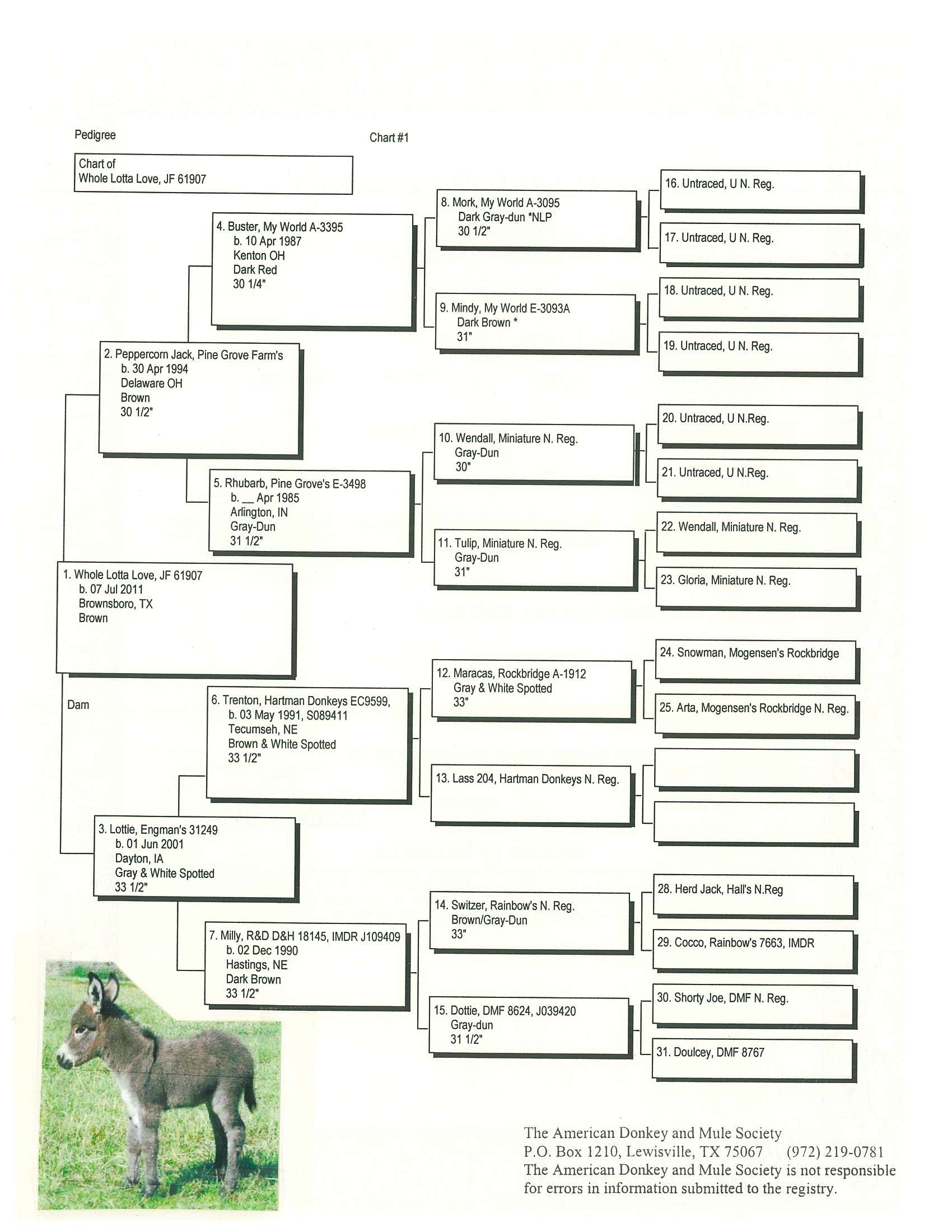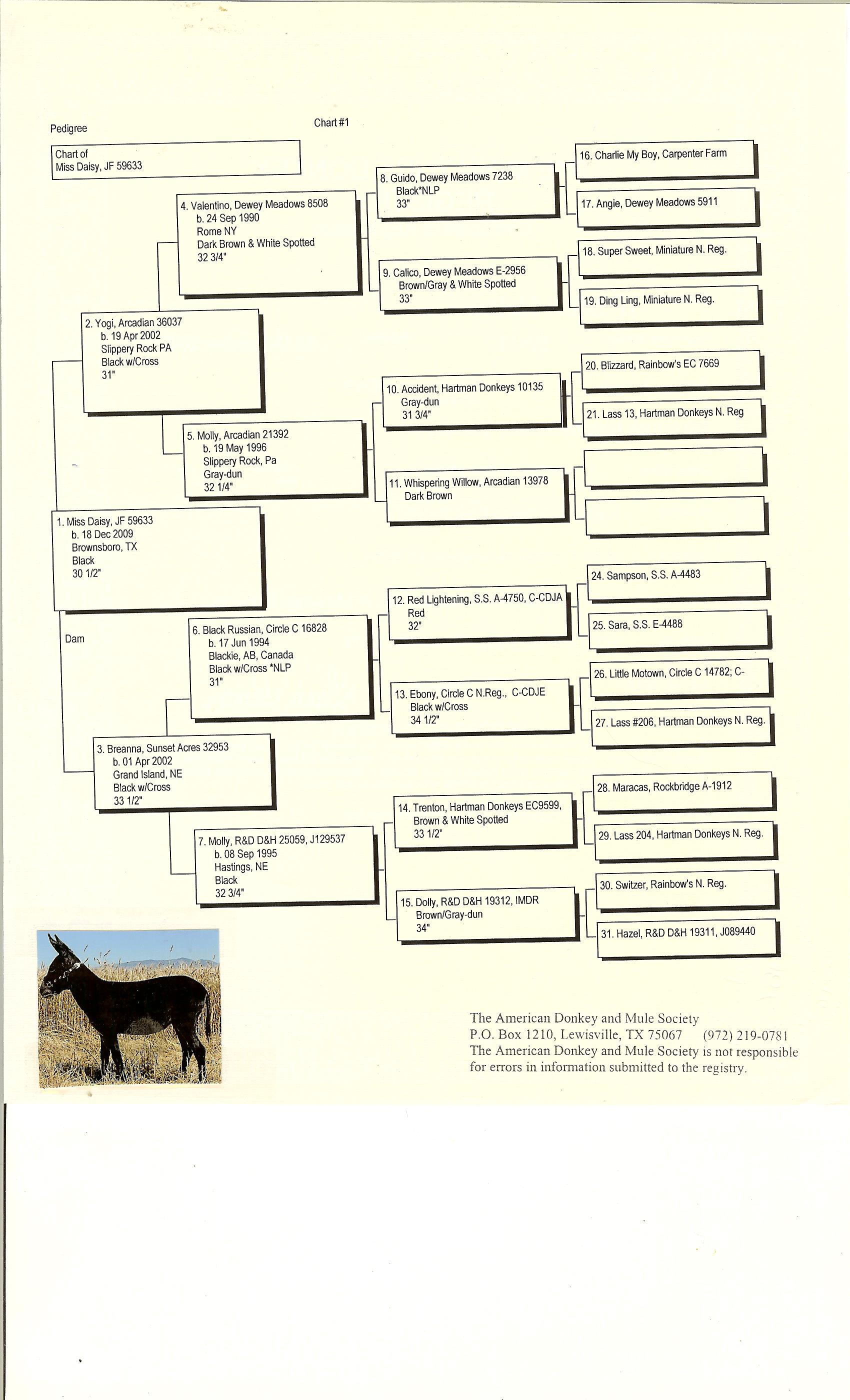 33.5" Dark Brown Emmy Lou is my first foal out of her dam, Tillie and I are very pleased with the result. Tillie has produced a national champion jack and best of breed as well as being a three time national high point jack. Emmy Lou is a fun loving, attractive girl with a look at me personality. Her friendly personality leads to her receiving plenty of well deserved hugs. Sire and Dams Pedigree