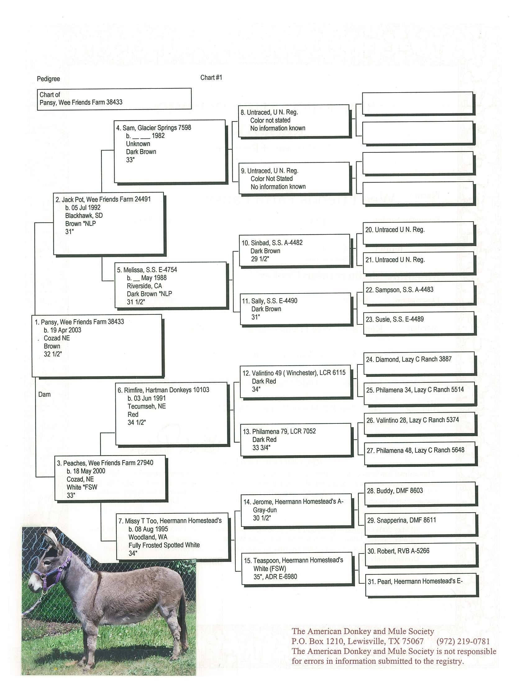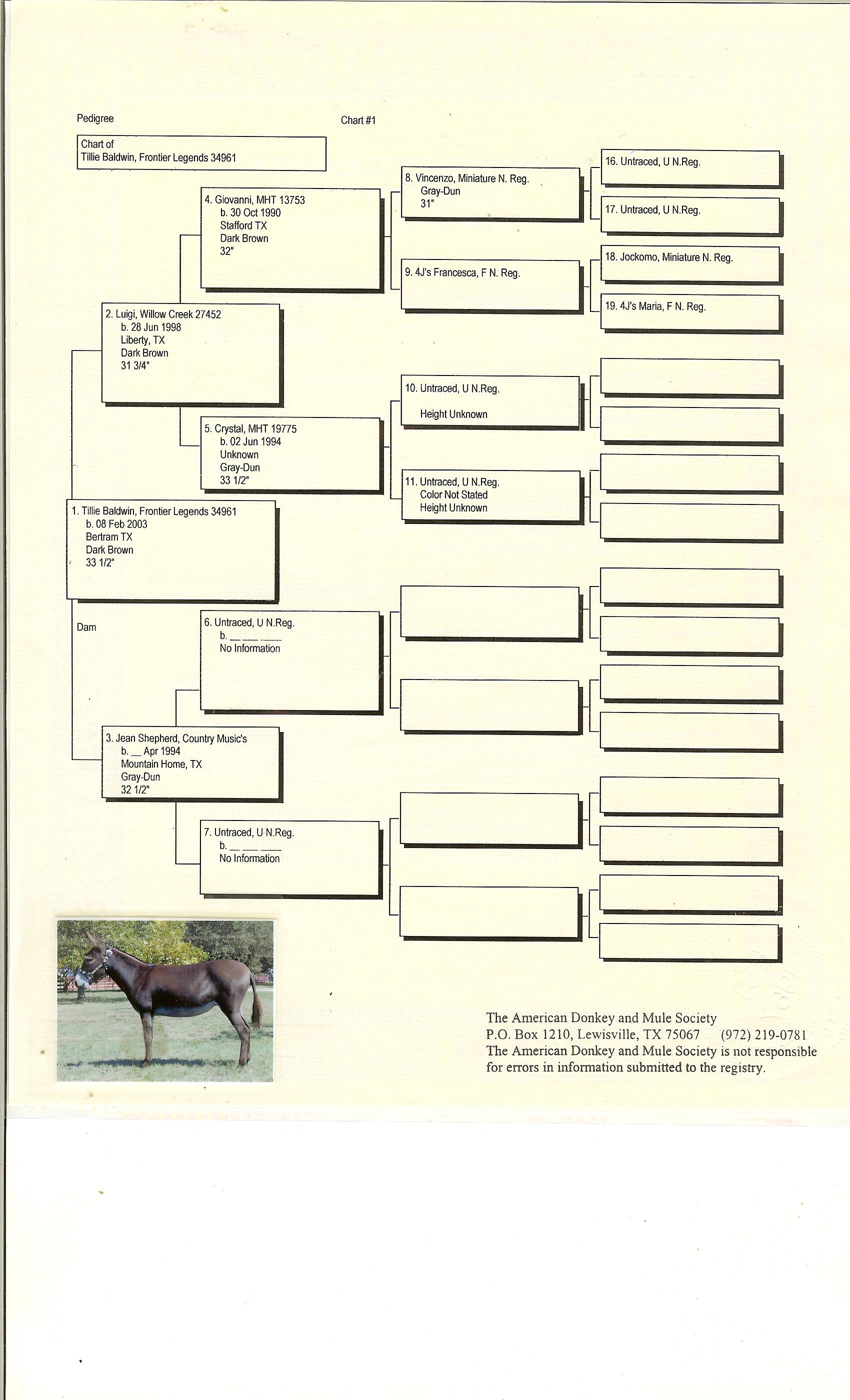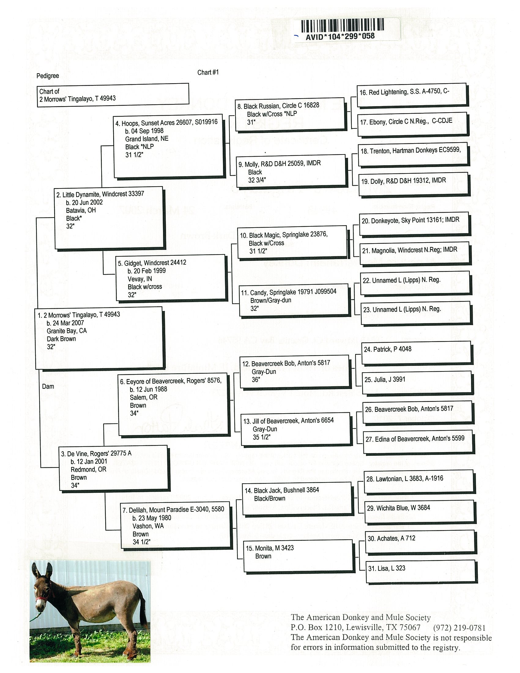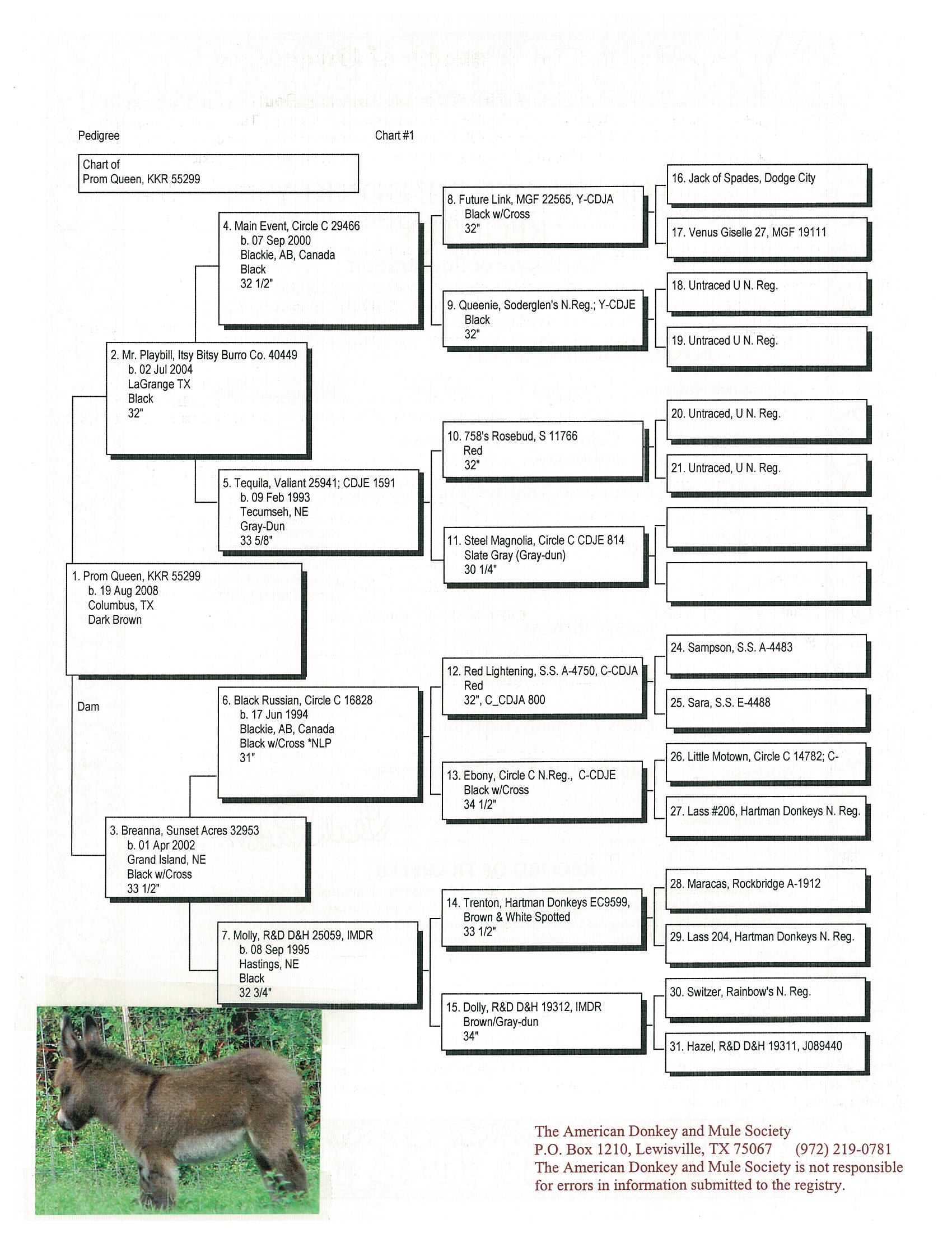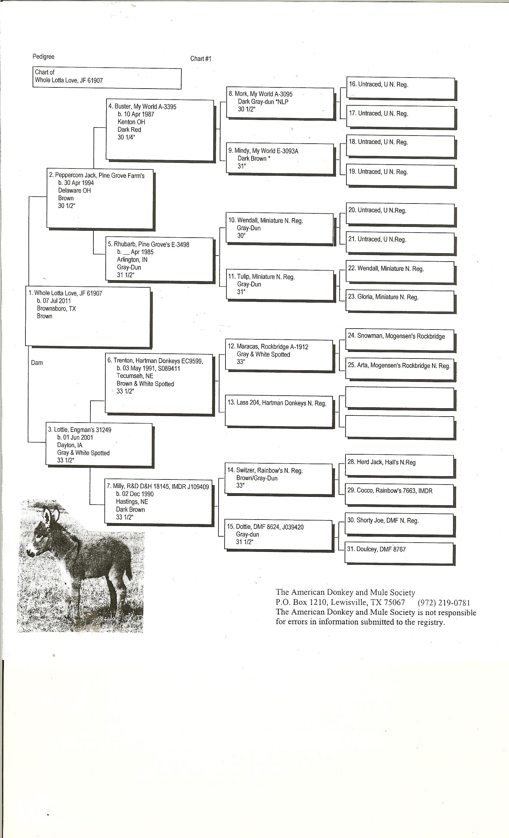 33.5" Dark Brown Emmy Lou is my first foal out of her dam, Tillie and I are very pleased with the result. Tillie has produced a national champion jack and best of breed as well as being a three time national high point jack. Emmy Lou is a fun loving, attractive girl with a look at me personality. Her friendly personality leads to her receiving plenty of well deserved hugs. Sire and Dams Pedigree