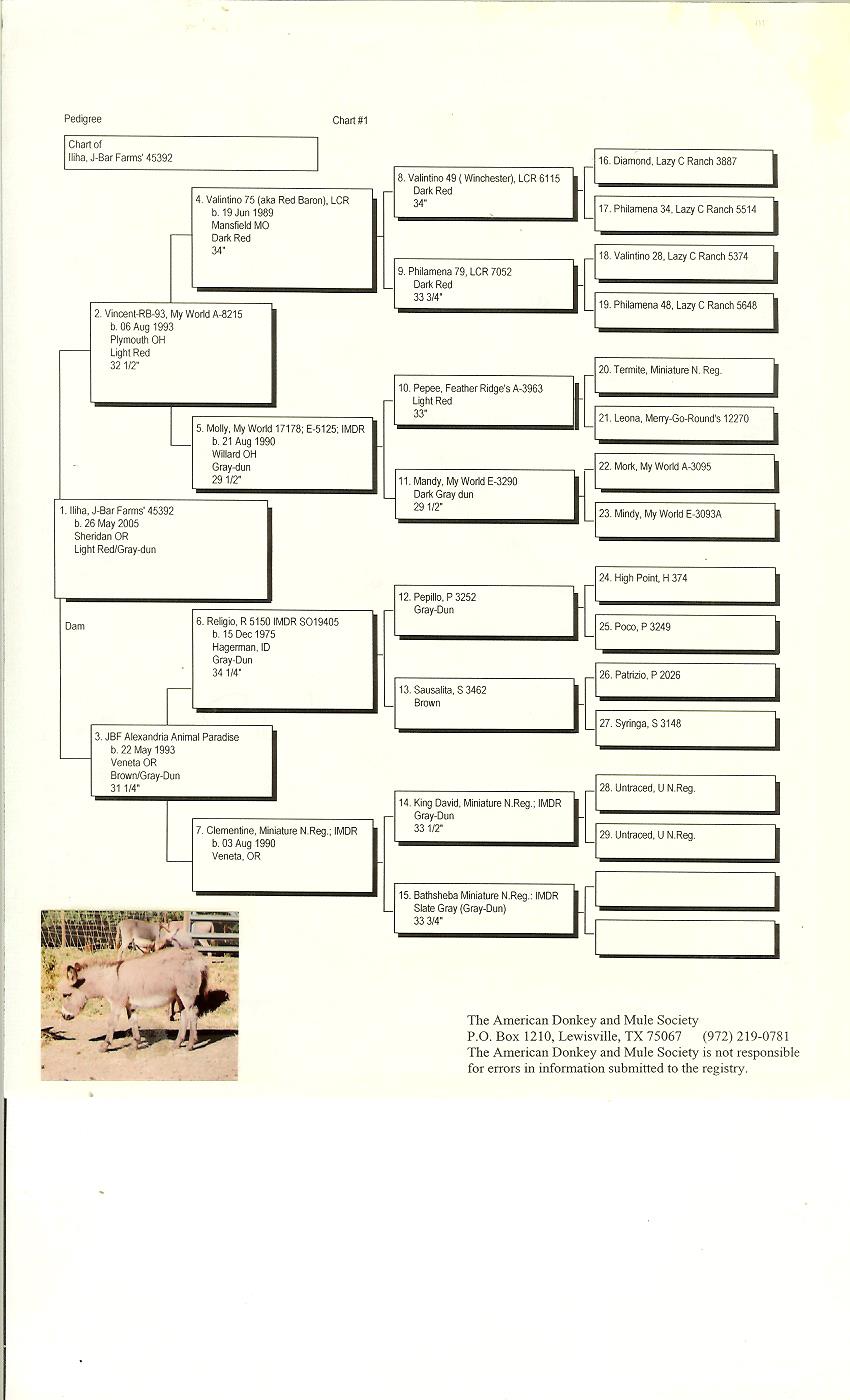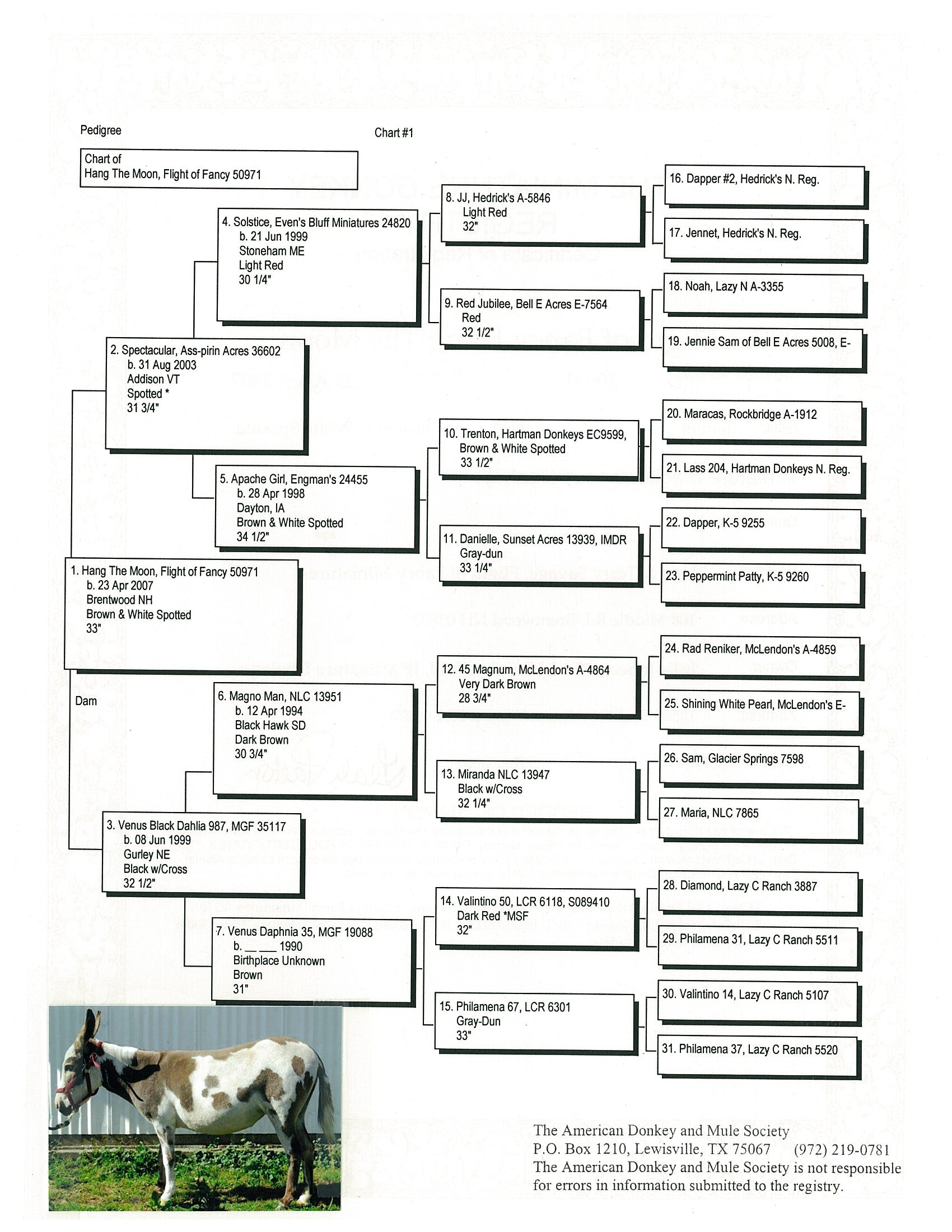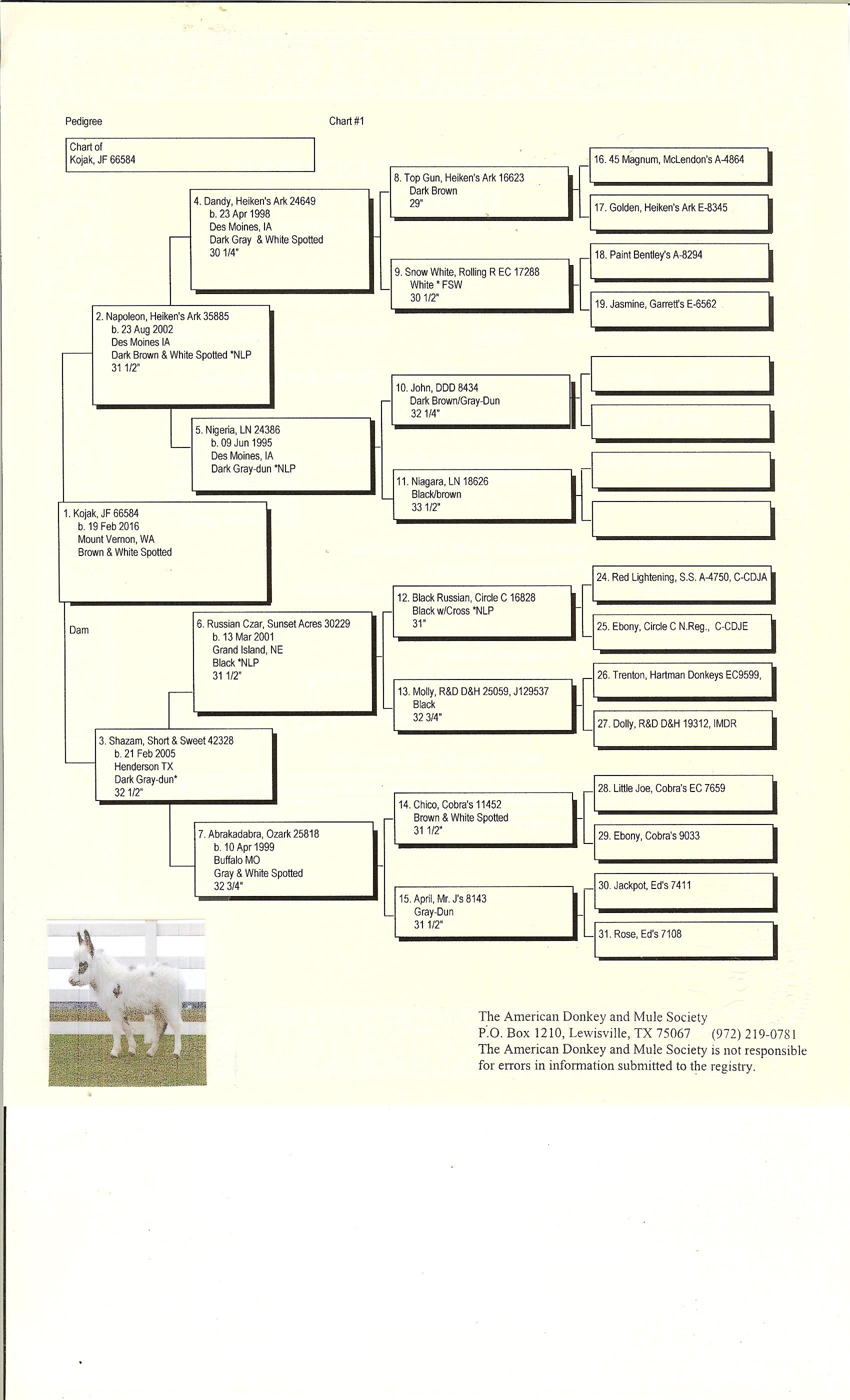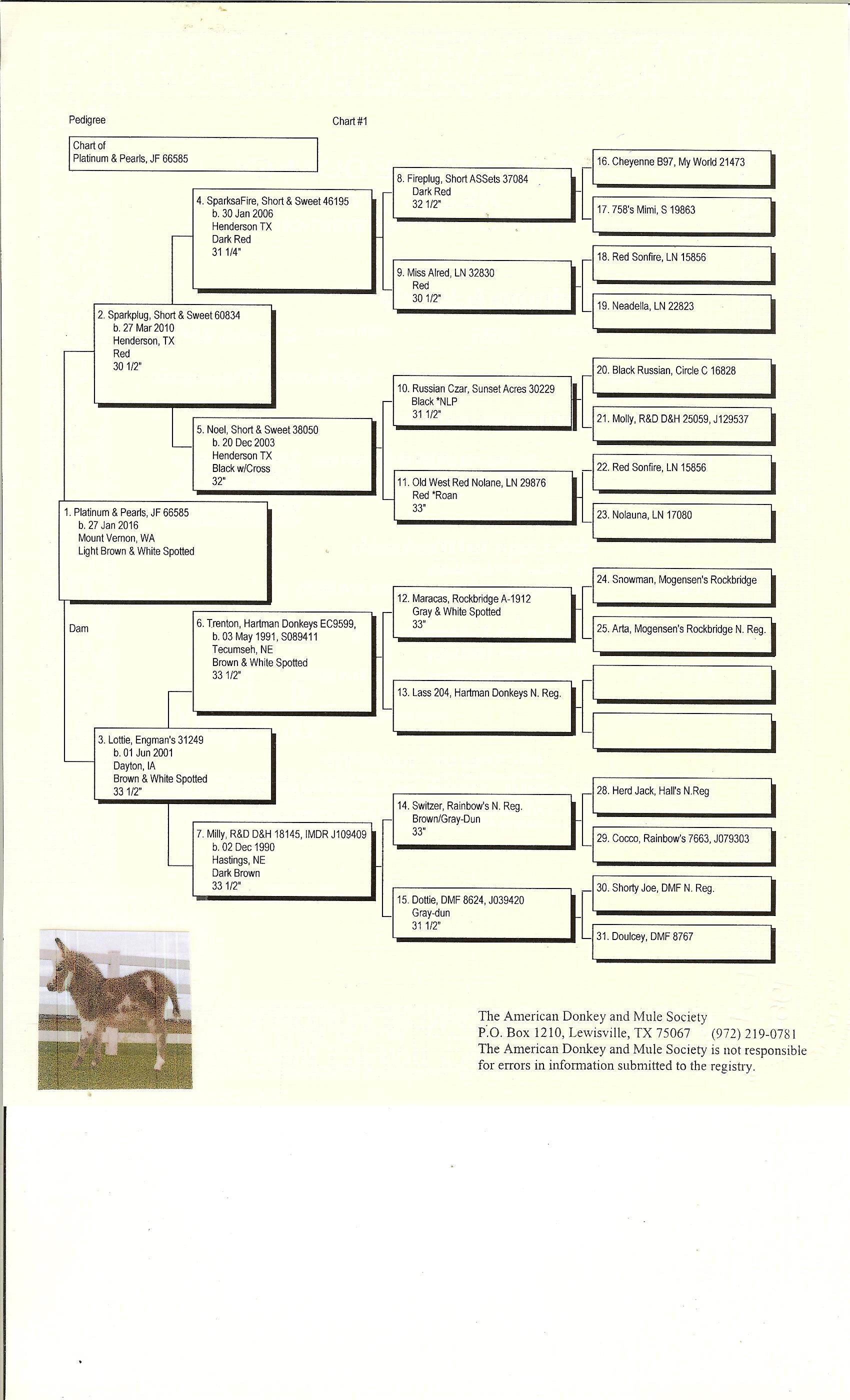 "Pedro" was my last foal born in 2014 and I never got around to taking his newborn photos. He has a funny, friendly personality and will make a entertaining family pet. Pedro is quite smart and willing so he could also make a fun show donkey and in the future very nice driving donkey. Sire and Dams Pedigree