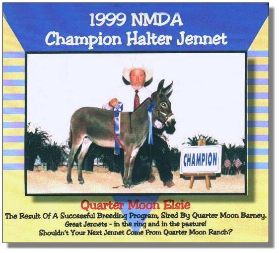 Quarter Moon Top Dollar's Show Record NMDA National Champion Jack & Best of Breed NMDA Nationals Grand Champion Jack & Best of Breed Texas State Championship Grand Champion San Antonio Livestock Show Reserve Grand Champion - Houston Livestock Show Junior Grand Champion - San Antonio Livestock Show