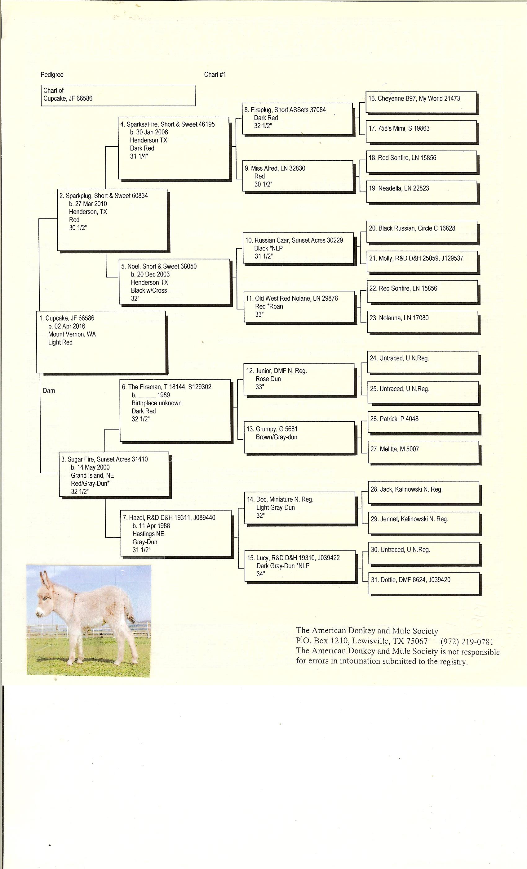 Light Red If you love gorgeous red donkeys with all the bells and whistles here's your girl. Genie is staying small, drafty, has great legs, a fun loving attitude, and fantastic pedigree. Her maternal sister won the yearling jennet class at the 2012 national show and is now living in a breeding herd in France.
