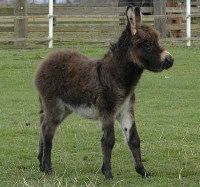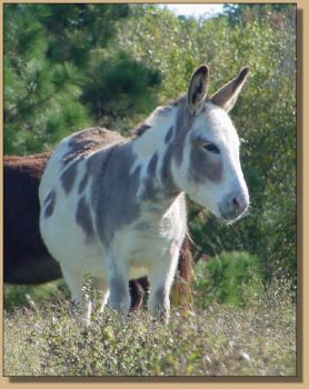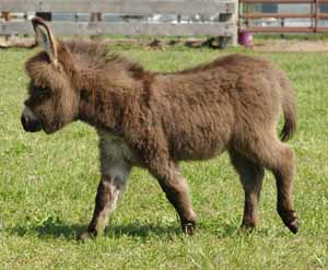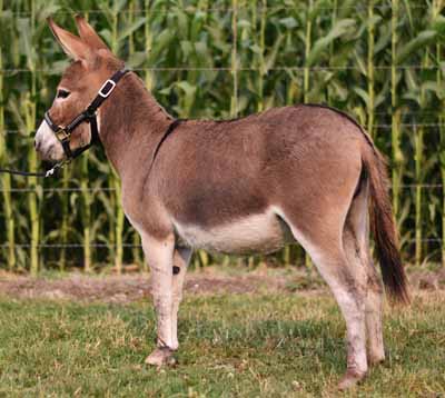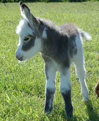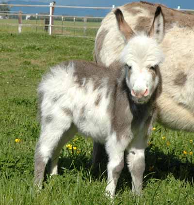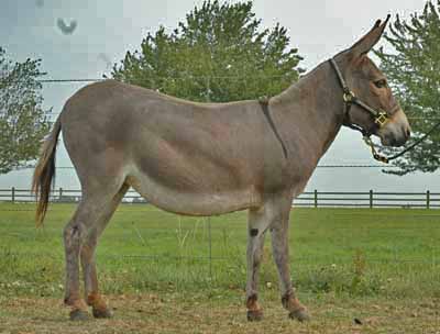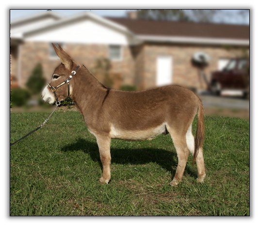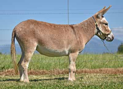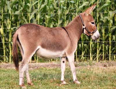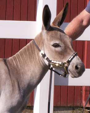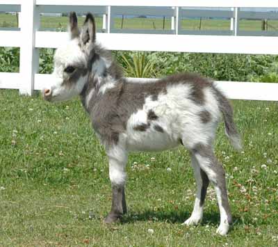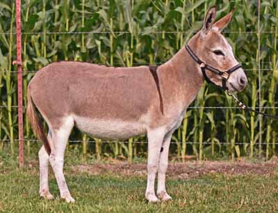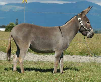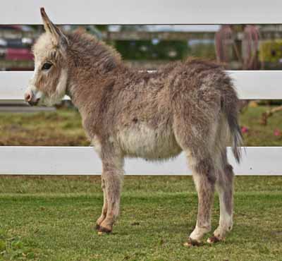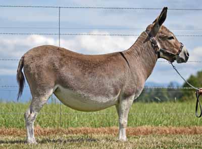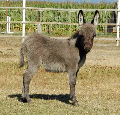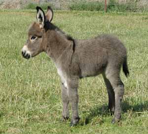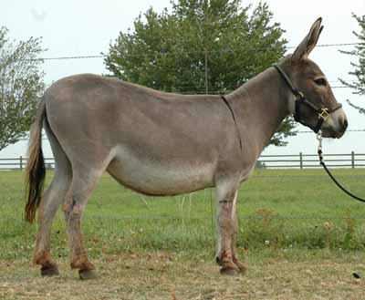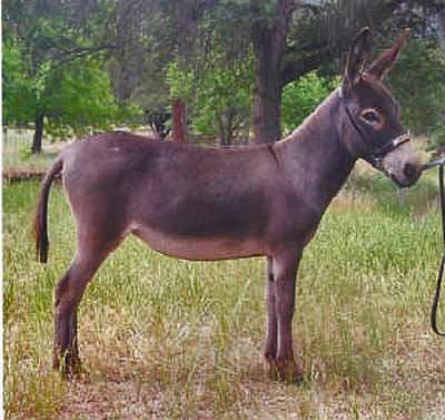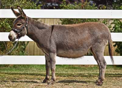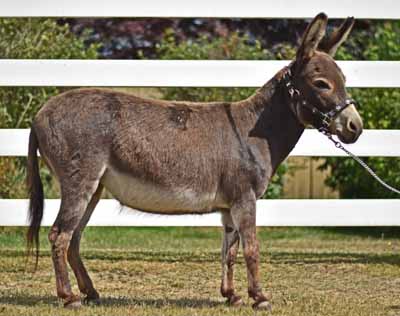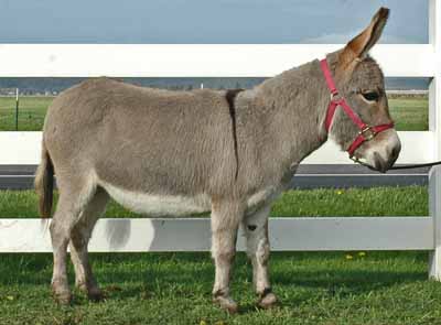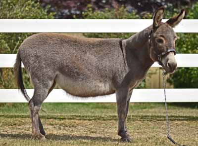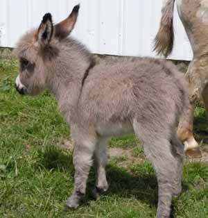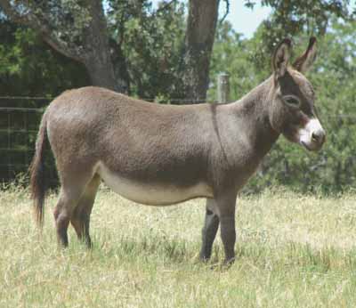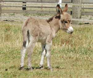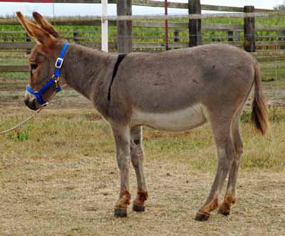 , 31" Gray-Dun Click to enlarge AMDS complete Pedigree Baby joined the herd from Quarter Moon Ranch. I am flattered that Quarter Moon Ranch gave me the opportunity to purchase their last three jennets. They kept the best for last! Quarter Moon Ranch has been a long time top breeder of national champion donkeys and their bloodlines are respected worldwide Comments from Quarter Moon Ranch : Baby is one of the stockiest jennets we ever bred. Thick but not masculine with a beautiful head and full rear. She tends to have spots when bred to a spotted jack. Her babies have birth heights from 19" to 20 1/2". She throws small ones. She is one of my favorites.