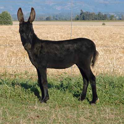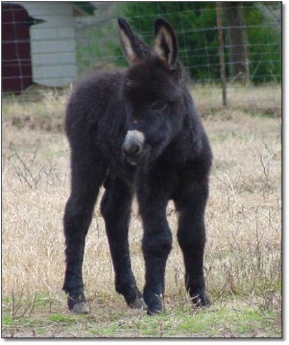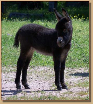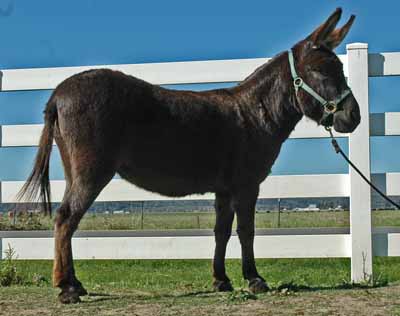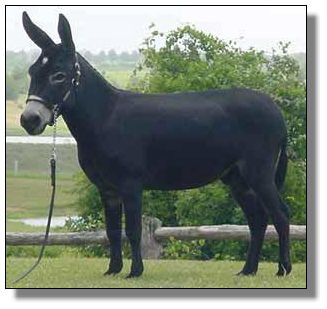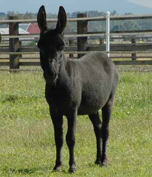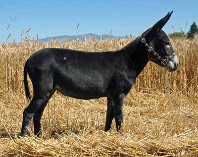 D&H Molly, 32.75" Black Click to enlarge AMDS complete Pedigree Breanna not only has a pretty head, full body, gorgeous hip, and a loving personalilty, but also a fantastic pedigree. She's a full sister to the well known black jacks; Sunset Acres Hoops and 2008 NMDA National Champion Jack producer, Sunset Acres Russian Czar. Her dam also produced 2006 NMDA National Champion Jack and Best of Breed, Sunset Acres Smart Derby. Breanna's 2008 black jennet by Itsy Bitsy Mr Playbill, KKR Prom Queen, is so stunning I added her to the herd too! (see her lower on this page). She placed second in the foal class at the 2009 Oregon Mule and Donkey Show and second in the two year old jennet class at the 2011 Oregon Mule and Donkey Show. Foaled a tiny 18" BLACK jennet 12/18/09, JF Miss Daisy byArcadians Yogi, a 31 inch Black jack! Breanna is the dam of the following foals: 1. Li'l Angels Moon Shadow (by McMillans Gamblers Echo) 2005 black jack. 2. Li'l