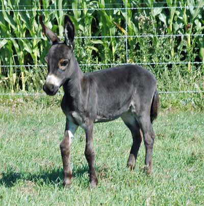 32.25" Dark gray Spotted Tulip is staying with me! She is the first foal out of my show winning jennet, Almond Joy. It will be interesting to see what color she will be as she gets older. Her sire is our dark red jack, Sparkplug. Tulip is wide and compact and has a perfect bite. This little girl is always entertaining to watch.