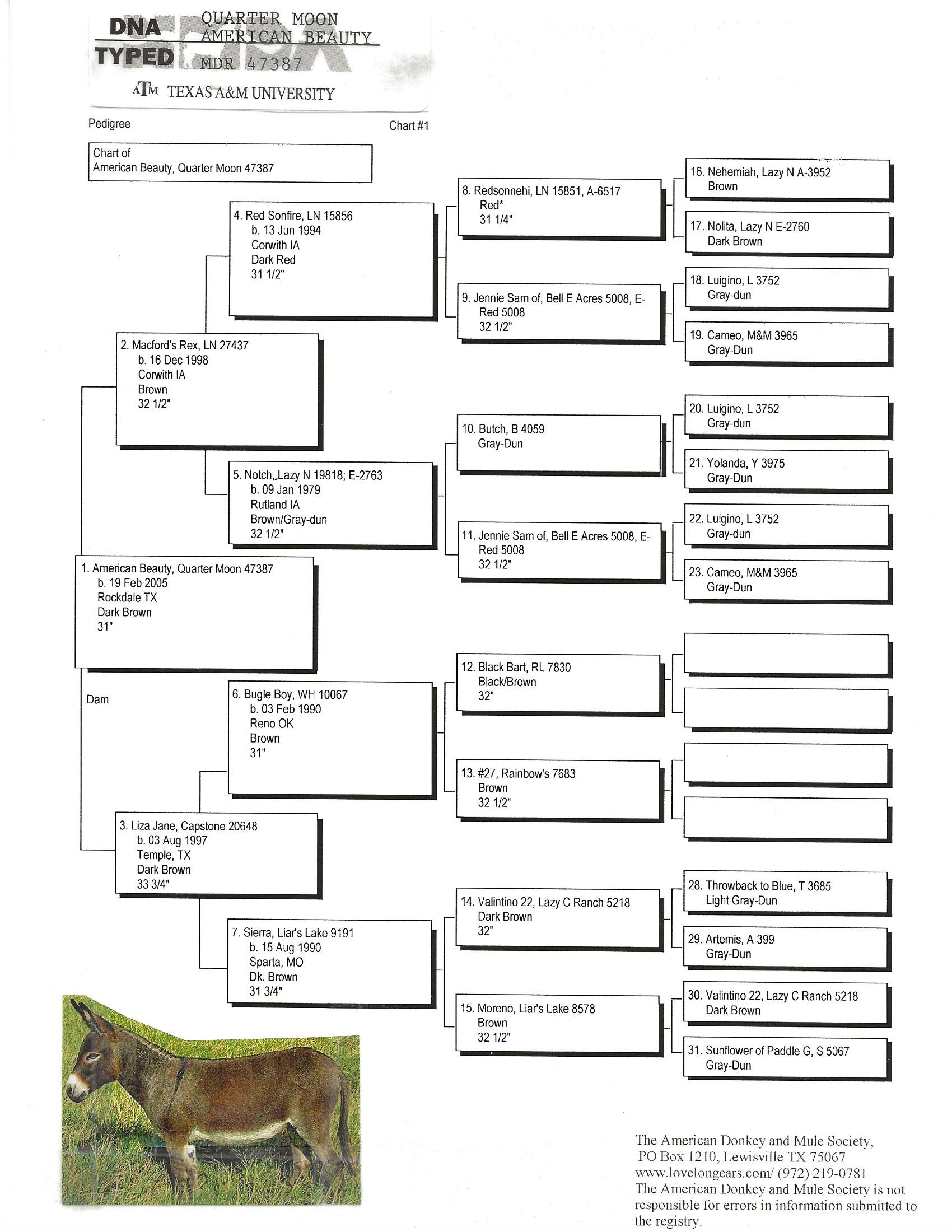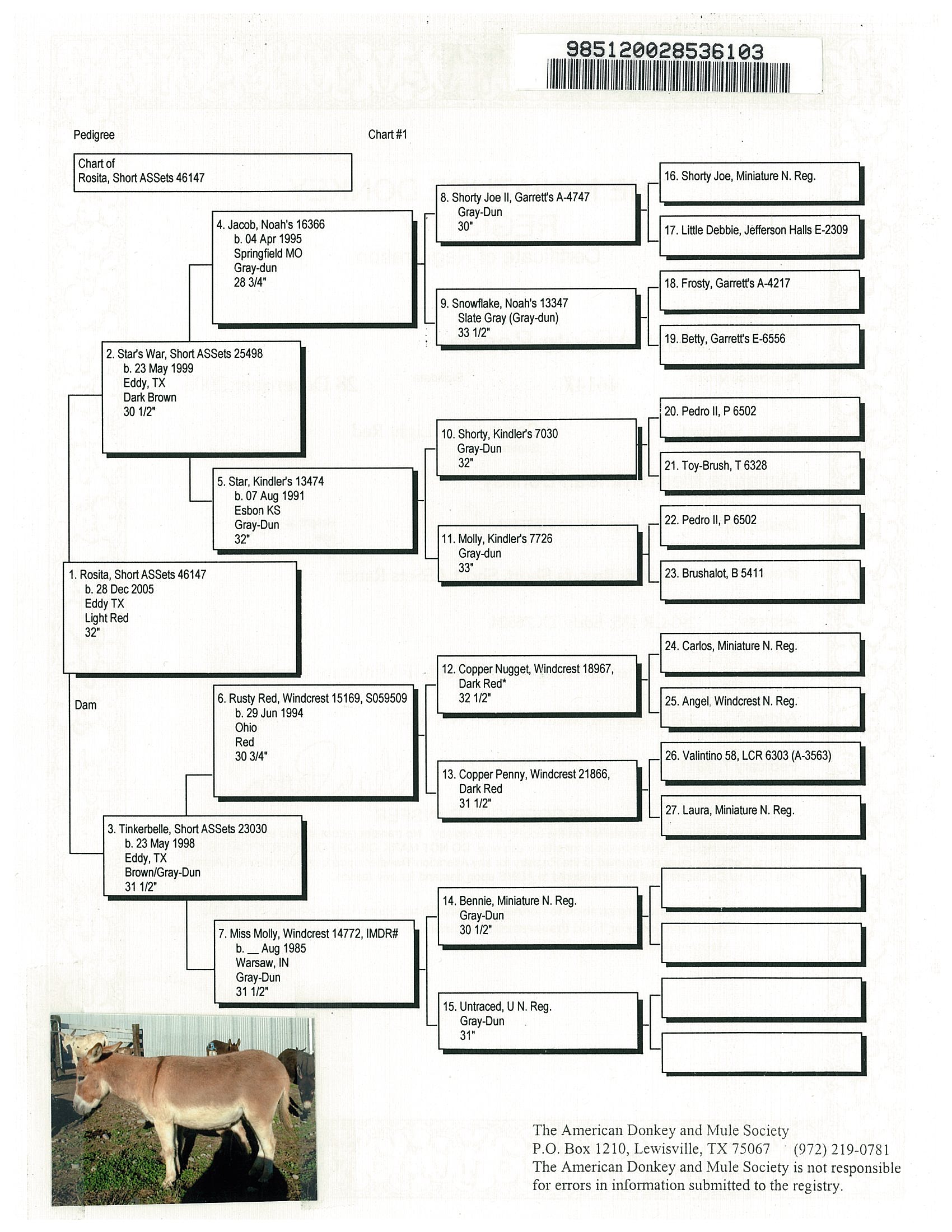 Click to enlarge AMDS complete Pedigree Thank you Patrica Oertli for providing the information below with regards to Tillie. I am very proud to own her. Regarding Tillie, she produced three foals for me. Her first was a jack, Augustus. He was sold to Jeannie Richards and was never shown. The second was Wyatt Earp. I have attached a picture from a show in Shelbyville. He was sold to Sandi Costa after this show. She trained and showed him before he was sold to Debby Miller (Miller’s Meadows), who still owns him. Wyatt has quite the show record, however, I don’t have a list of all his wins. As mentioned earlier, he was the NMDA 2014 Champion Jack and Best of Breed, as well as in 2011, I believe. He was also NMDA Overall High Point Jack in 2011, 2013 and 2014. Her third foal was a Jennet, Lucy Allen, that was sold to BergHansen in California and she was never shown. Augustus and Lucy were sired by Short ASSets Starfire. Wyatt was sired by Frontier Legends Goldminer. I was always very fond of Tillie. She was a great producer. I know that she will have a very good home with you. Patsy