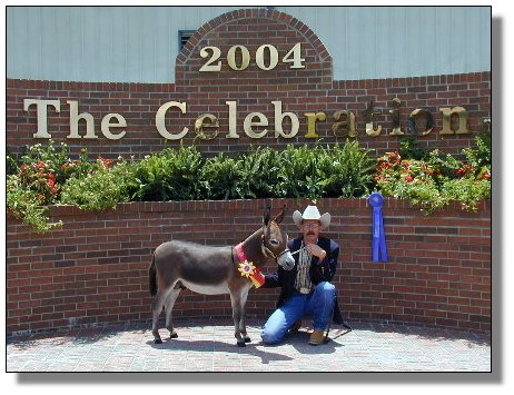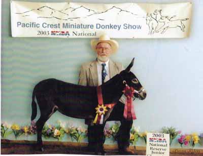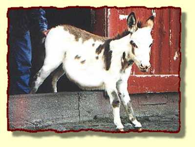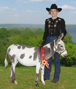 D&H Cinderella, 32½" Black/White Spotted Click to enlarge AMDS complete Pedigree Fabulous producer of show ring winners! Show Record Cinderbelle was 4th in the NMDA 2 Year Old Jennet Class at the Nationals in Shelbyville, Tennessee, June 27th, 2002, with over 20 entries!!! Cinderbelle was 5th at the State Fair of Texas Miniature Donkey Show September 29th, 2002, in the 2 Year Old & Over Jennet class with 20 entries! Dallas Stare Fair September 2003: Cinderbelle won the Jennets 2 and Over Halter Class and came back to win Reserve Model Donkey of the show!