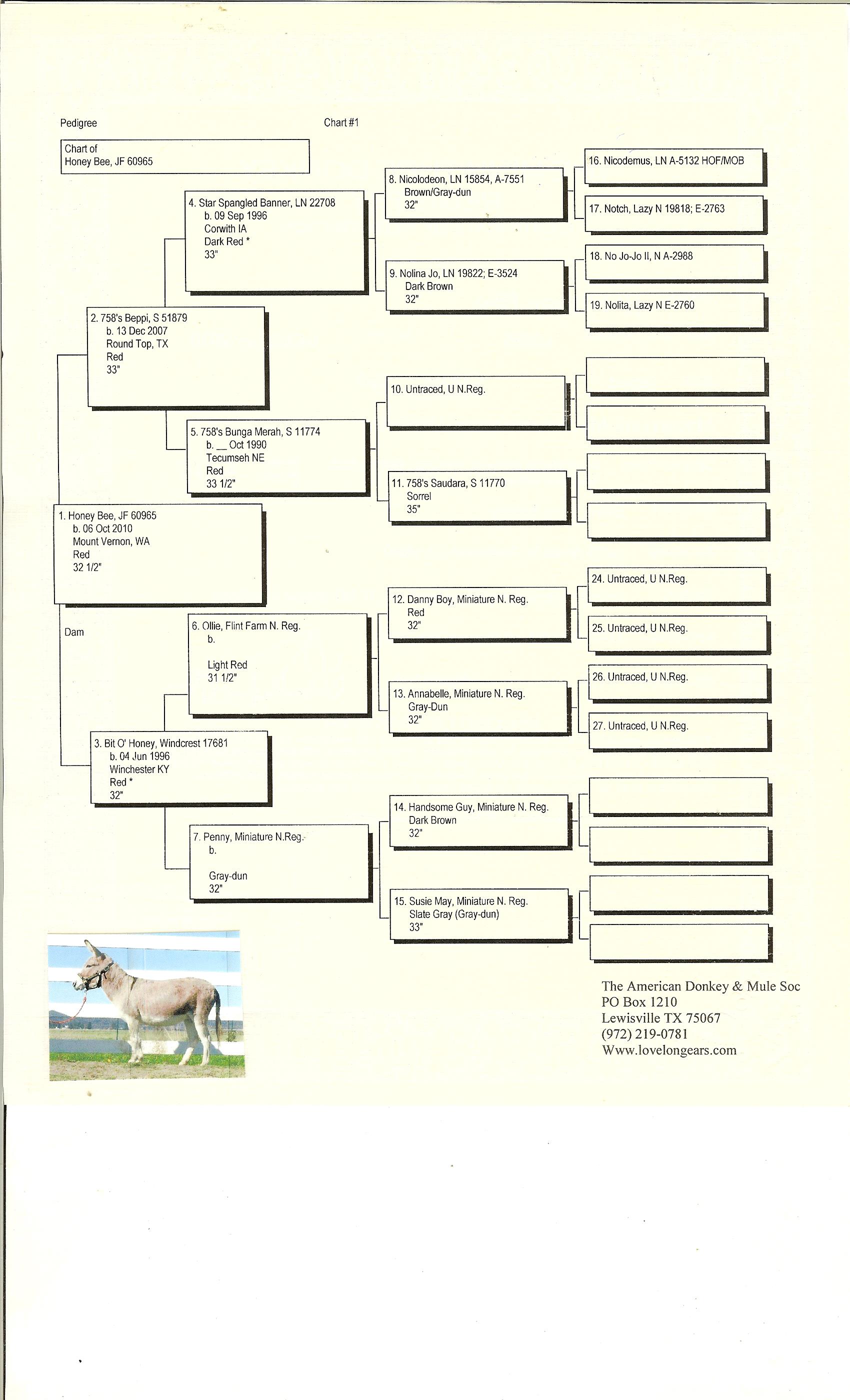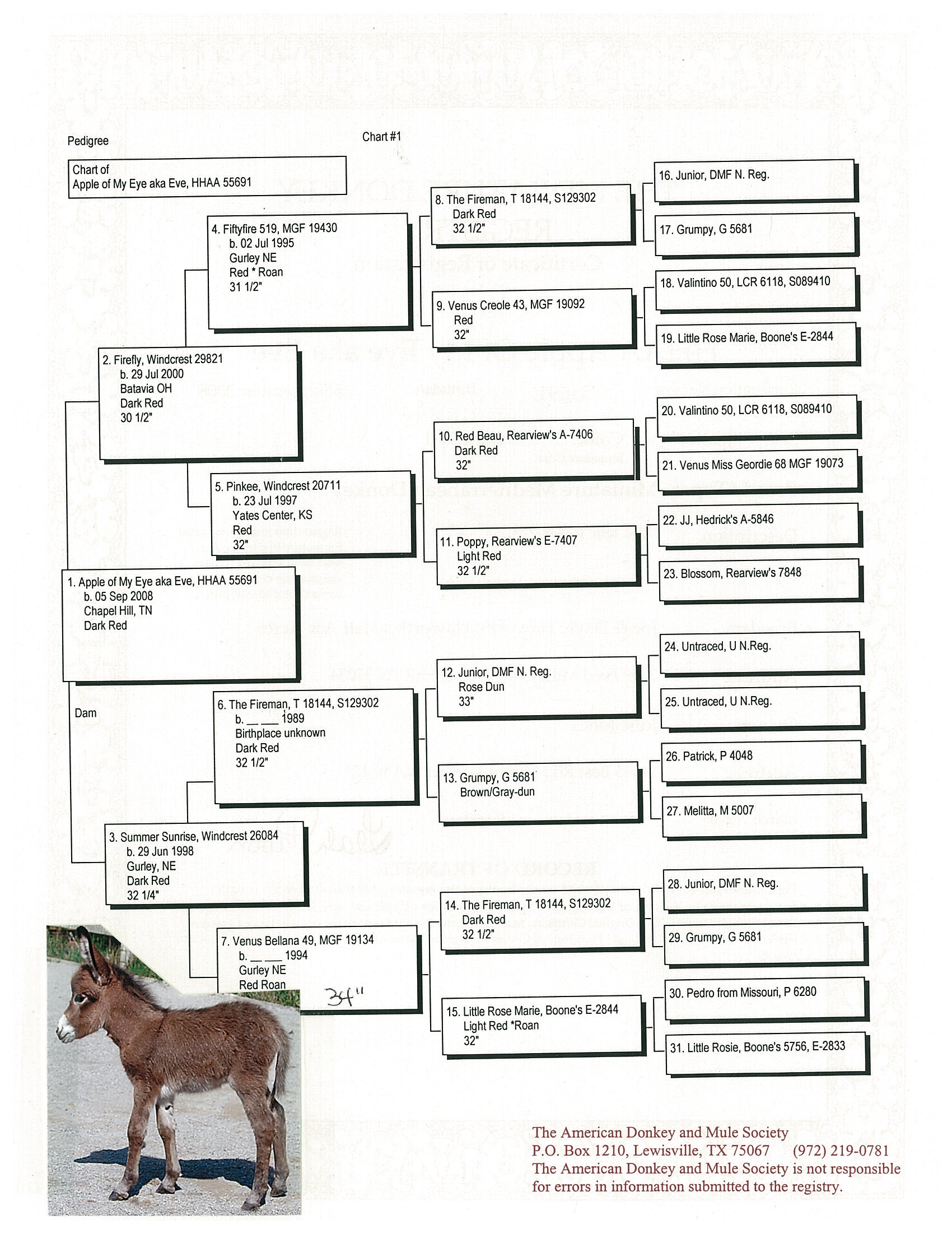 Show Record 2009 Oregon Mule and Donkey Show 1st NMDA Foals 2010 Oregon Mule and Donkey Show 1st NMDA Yearling Jennets 2010 Oregon Mule and Donkey Show NMDA Junior Champion 2010 NMDA National Show - 1st Yearling Jennets Apple is the dam of the following foals: 1.