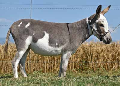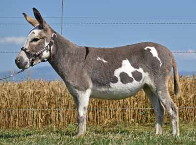 Abrakadabra, 32½" Gray & White Spotted Click to enlarge AMDS complete Pedigree Shazam has an extremely wide chest and rear, has a gorgeous head, and a beautiful set of legs. The two times she was shown prior to purchasing her she placed third in NMDA Foals at Halter class at the 2005 Dallas State Fair out of a class of fourteen and was again 3rd in a huge foal class at the 2006 Houston Livestock Show. I decided to take eight donkeys in a local 4th of July parade in 2010 so Shazam was body clipped. It's amazing to see the transformation after all of the last of the winter fuzz comes off. She was a trooper in the long parade route and we decided to add her to the show string. She placed first in the 4-9 year old jennets at the 2010 Oregon Mule and Donkey Show and was fourth in her age division at the 2010 NMDA National Show. Her 2009 foal, JF Black Pearl was second in a large yearling class at the 2010 national show and second in the two year old class at the 2012 national show. 2010 National NMDA 4-9 Year Old Jennets - 4th 2010 Oregon Mule & Donkey Show 4-9 Year Old Jennets - 1st Shazam is the dam of the following foals: 1. JF Black Pearl (by Heiken's Ark Napoleon) 2009 black nlp jennet 2012 National NMDA Two Year Old Jennets - 2nd 2010 National